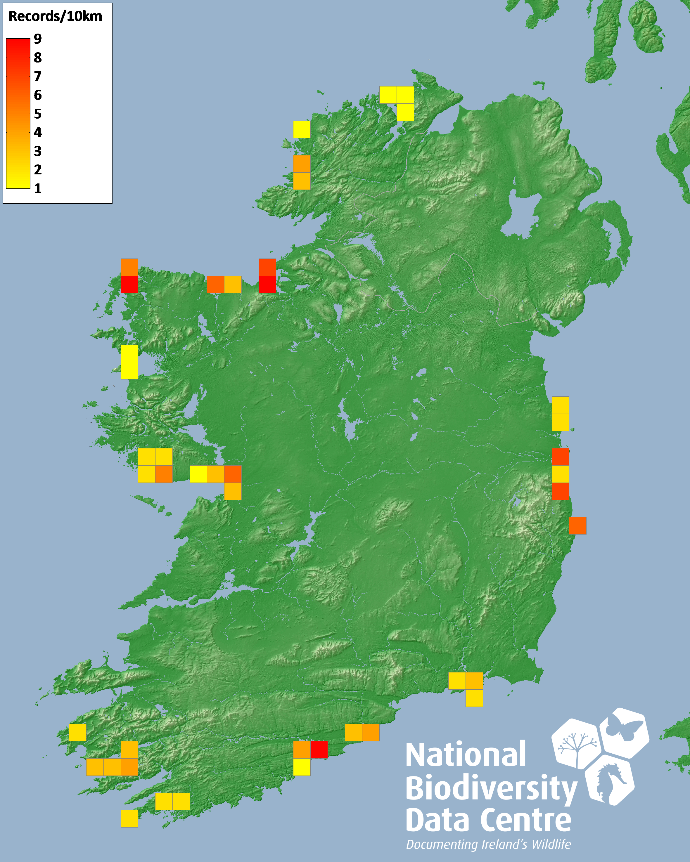 Distribution of the number of records recorded within each 10km grid square (ITM).Marine Map - 50km