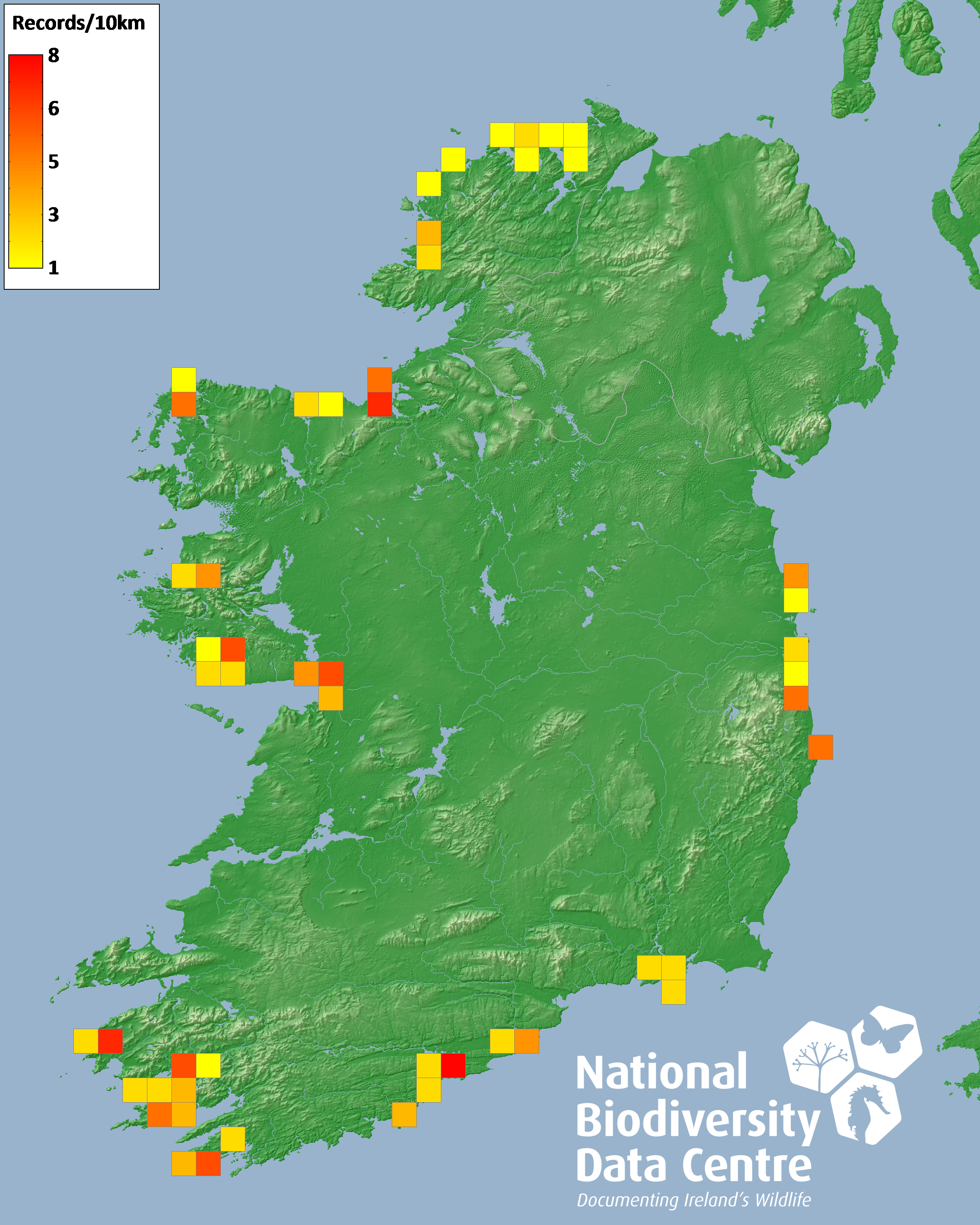 Distribution of the number of records recorded within each 10km grid square (ITM).Marine Map - 50km