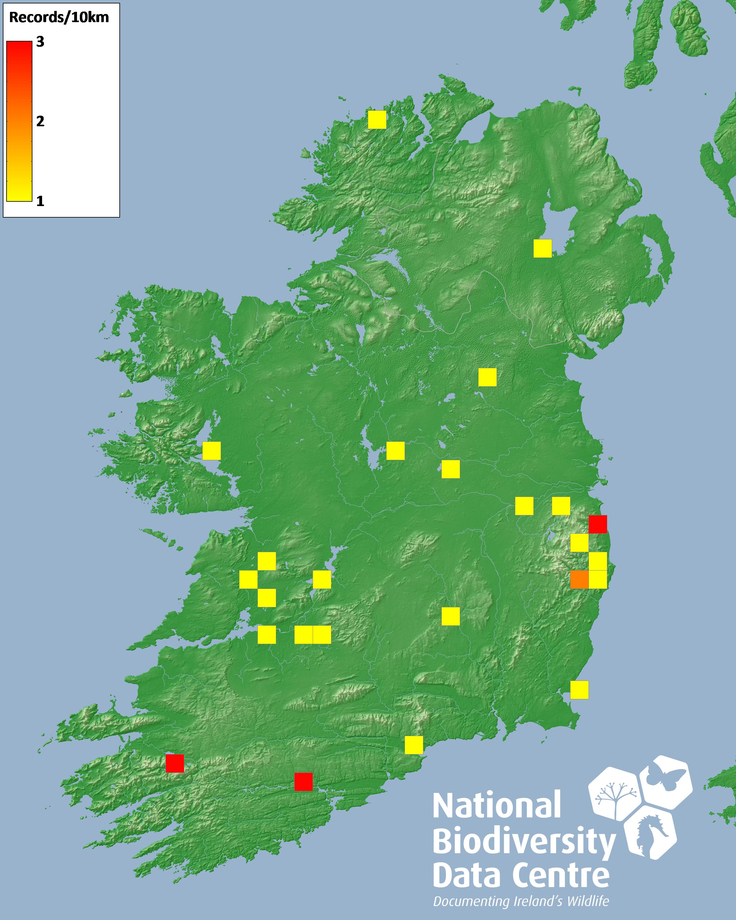 Distribution of the number of records recorded within each 10km grid square (ITM).Marine Map - 50km