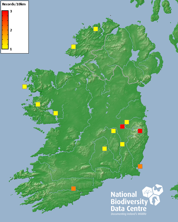 Distribution of the number of records recorded within each 10km grid square (ITM).Marine Map - 50km
