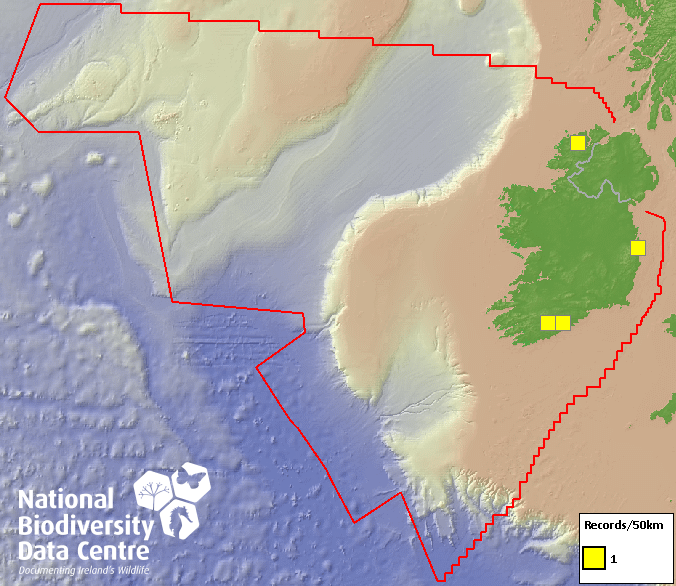 Distribution of the number of records recorded within each 10km grid square (ITM).Marine Map - 50km