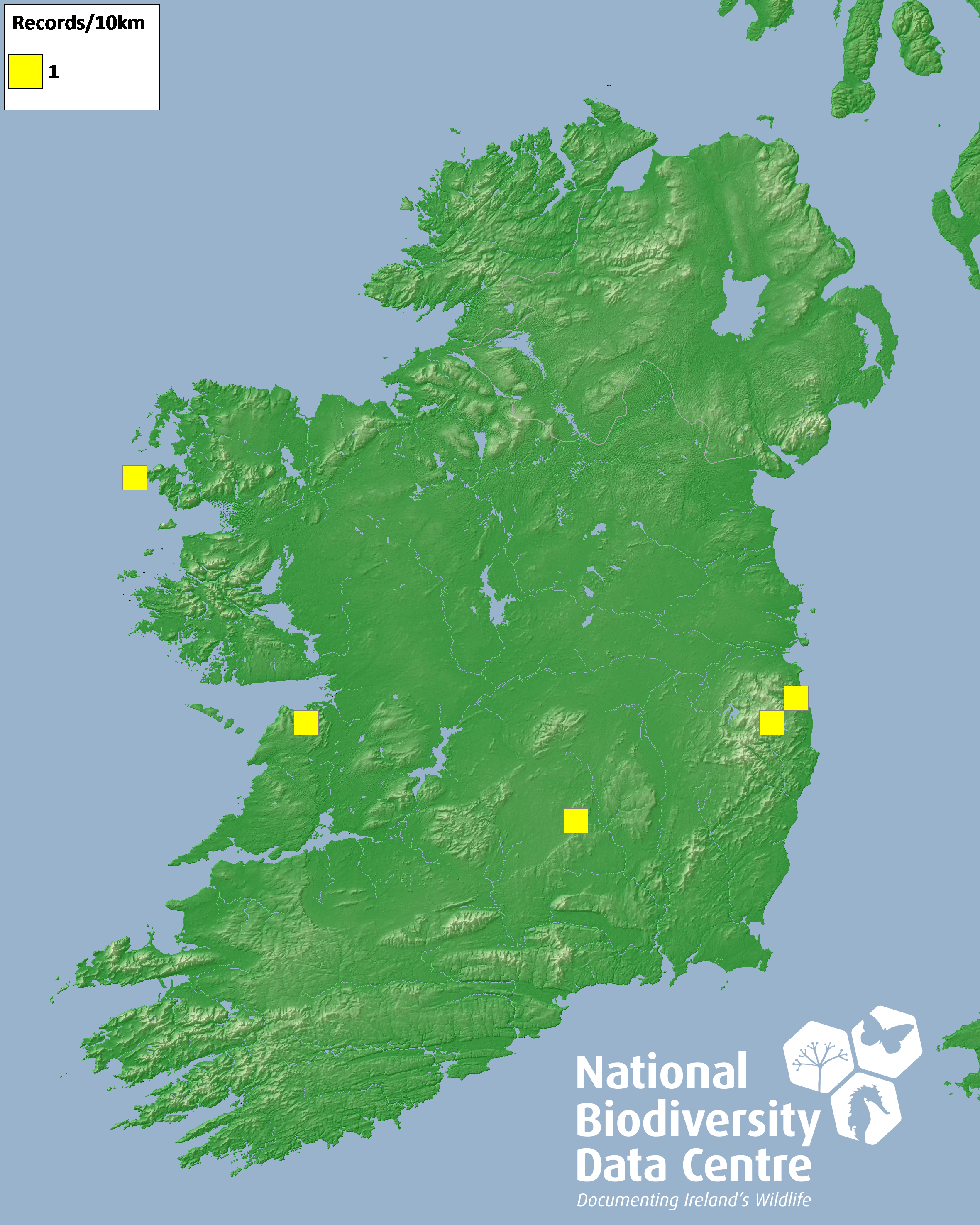 Distribution of the number of records recorded within each 10km grid square (ITM).Marine Map - 50km