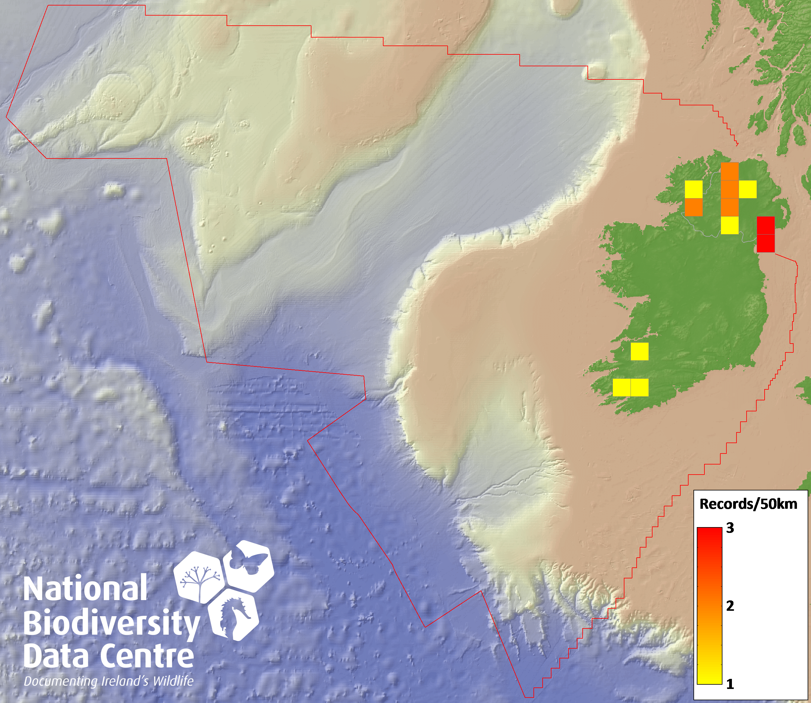 Distribution of the number of records recorded within each 10km grid square (ITM).Marine Map - 50km