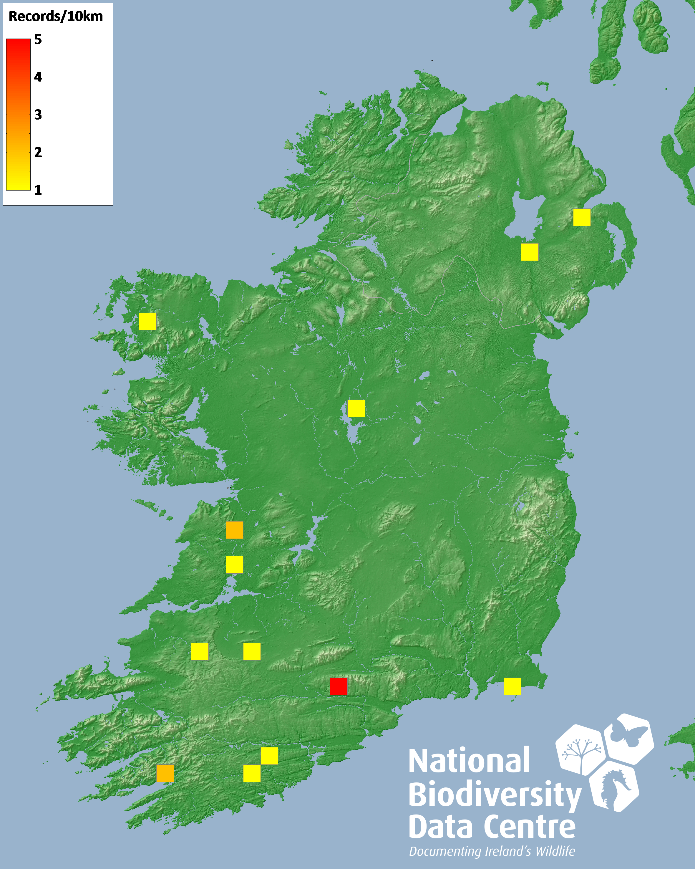 Distribution of the number of records recorded within each 10km grid square (ITM).Marine Map - 50km