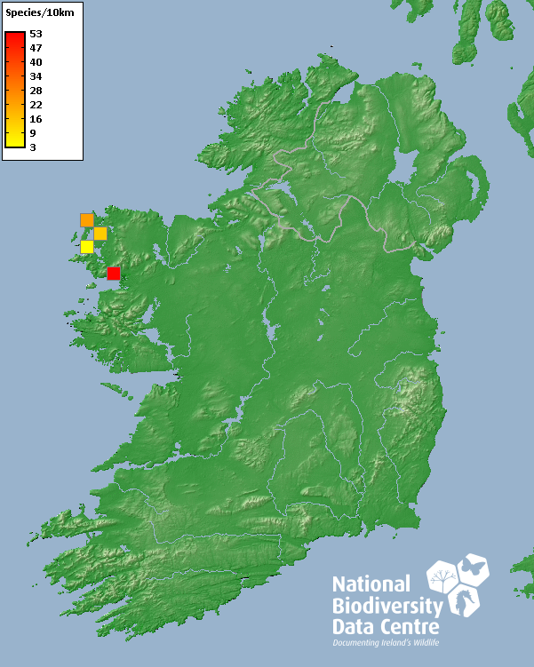 Distribution of the number of species recorded within each 10km grid square (ITM).Marine Map - 50Km