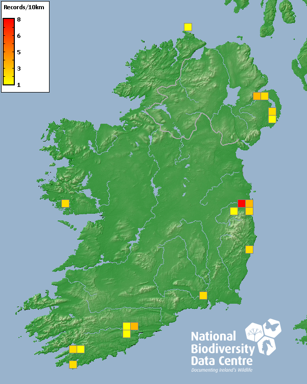 Distribution of the number of records recorded within each 10km grid square (ITM).Marine Map - 50km