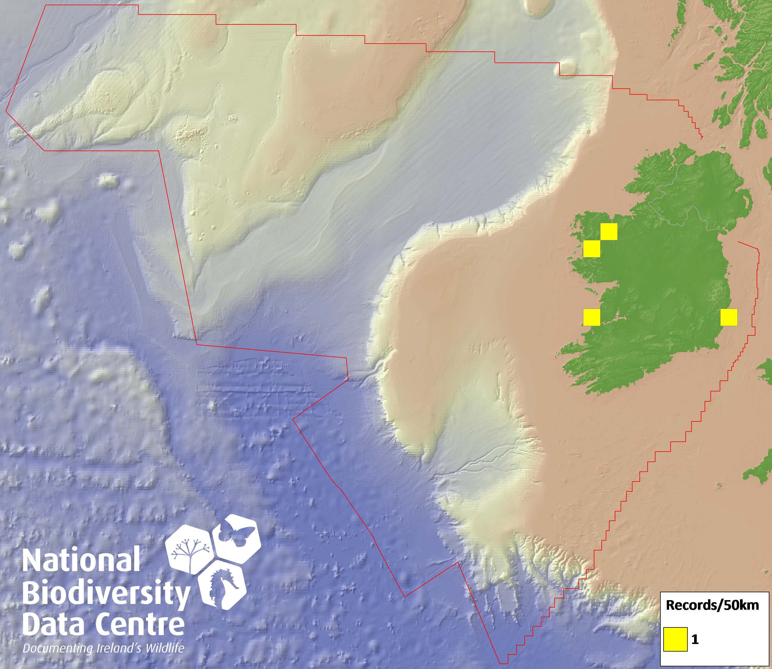 Distribution of the number of records recorded within each 10km grid square (ITM).Marine Map - 50km