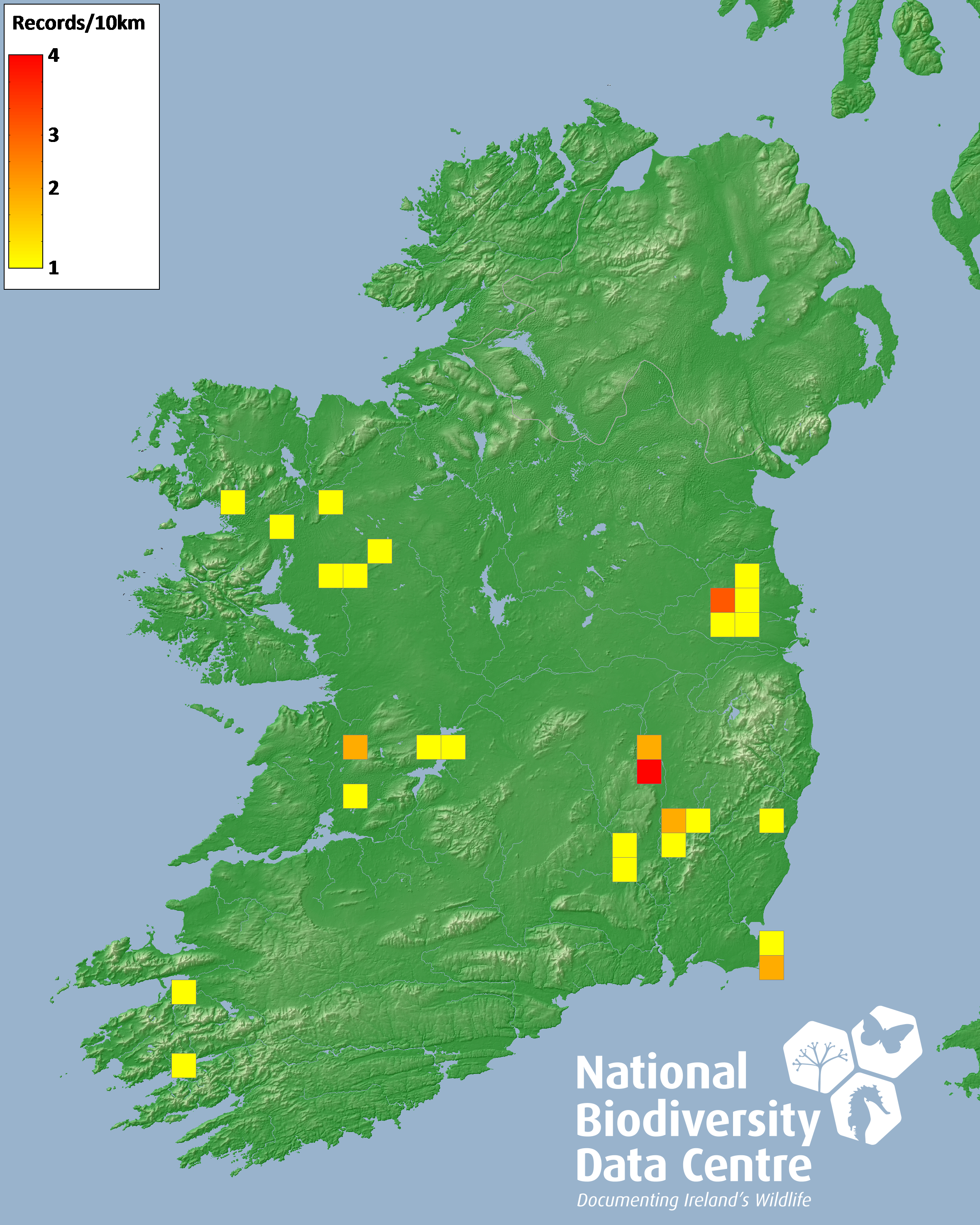 Distribution of the number of records recorded within each 10km grid square (ITM).Marine Map - 50km