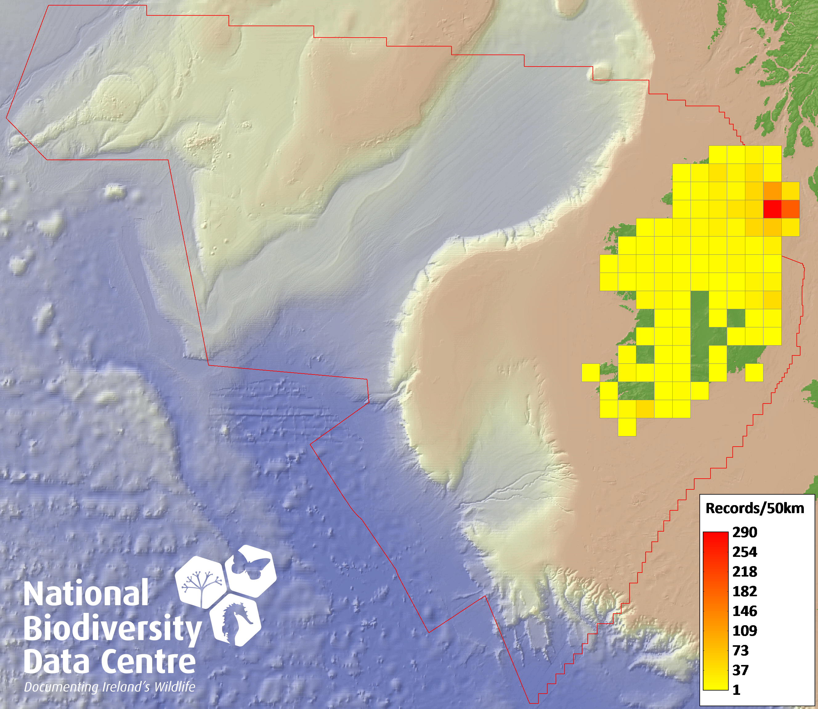 Distribution of the number of records recorded within each 10km grid square (ITM).Marine Map - 50km