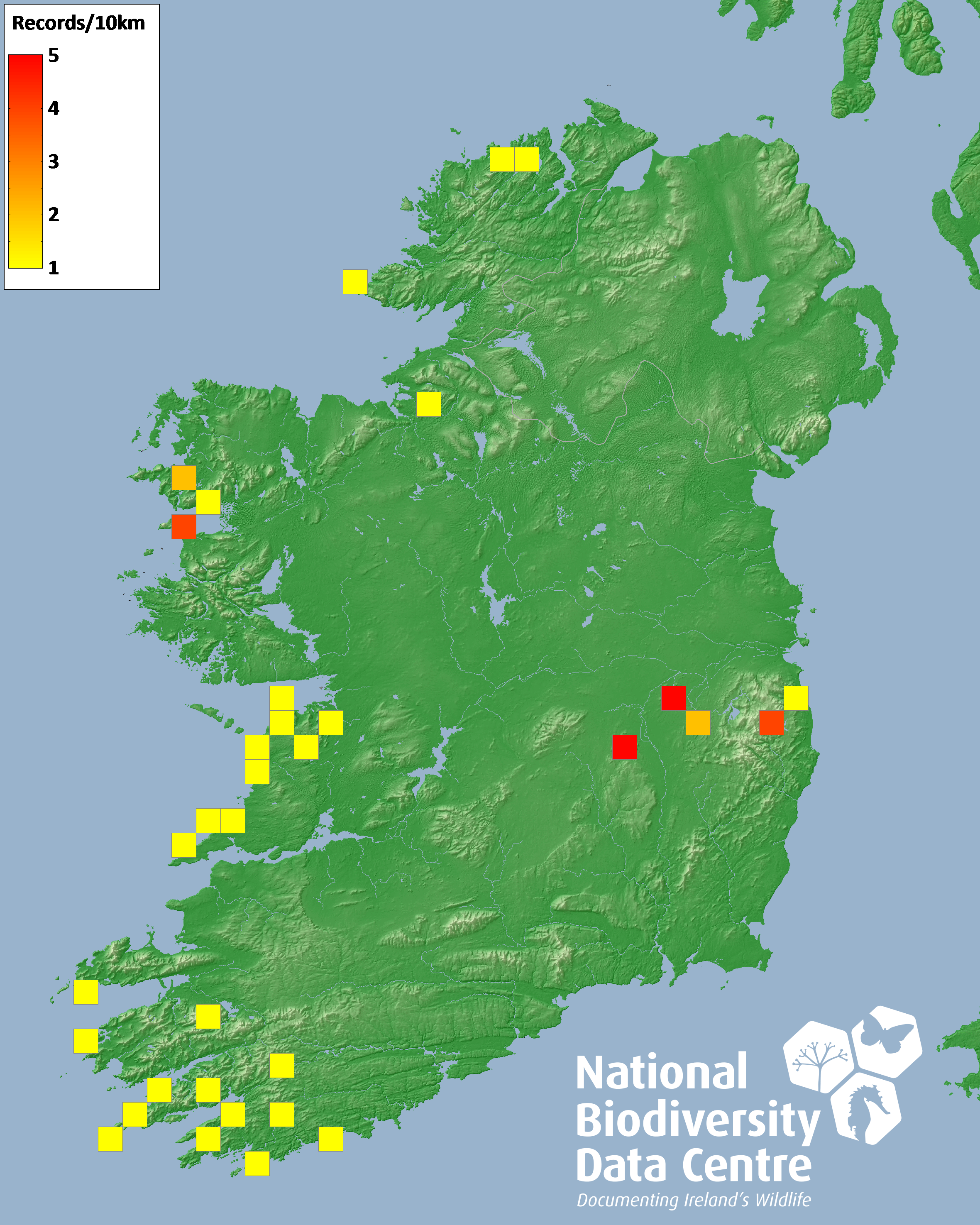 Distribution of the number of records recorded within each 10km grid square (ITM).Marine Map - 50km