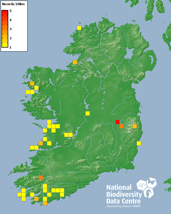 Distribution of the number of records recorded within each 10km grid square (ITM).Marine Map - 50km
