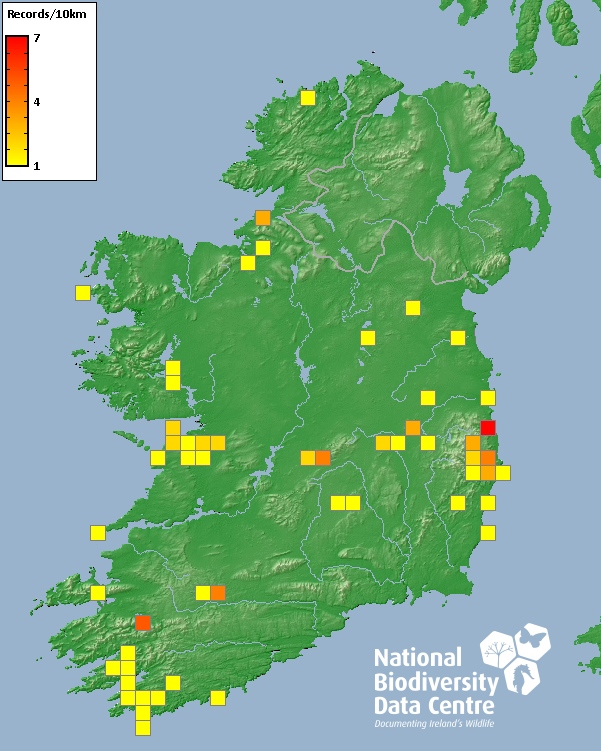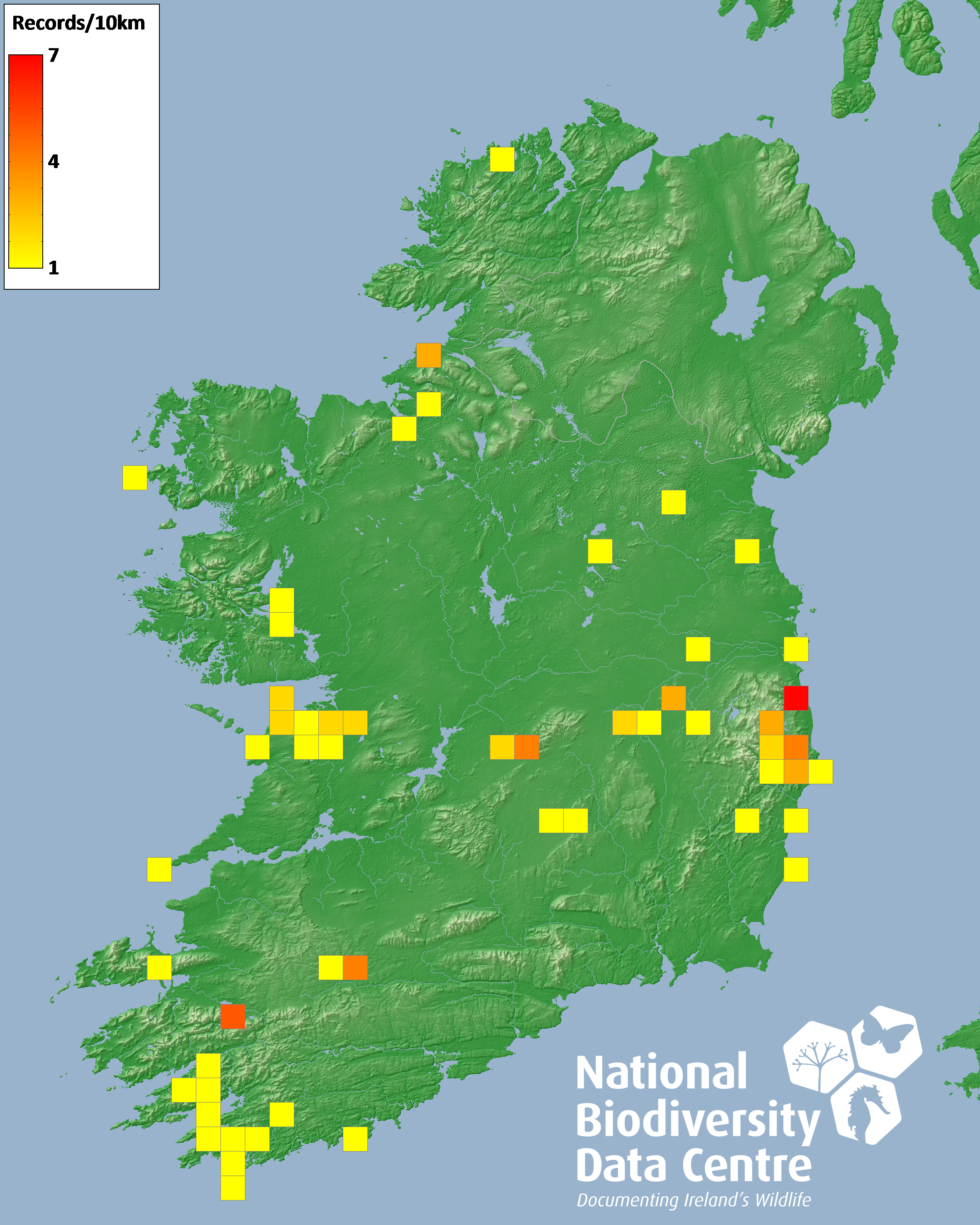 Distribution of the number of records recorded within each 10km grid square (ITM).Marine Map - 50km