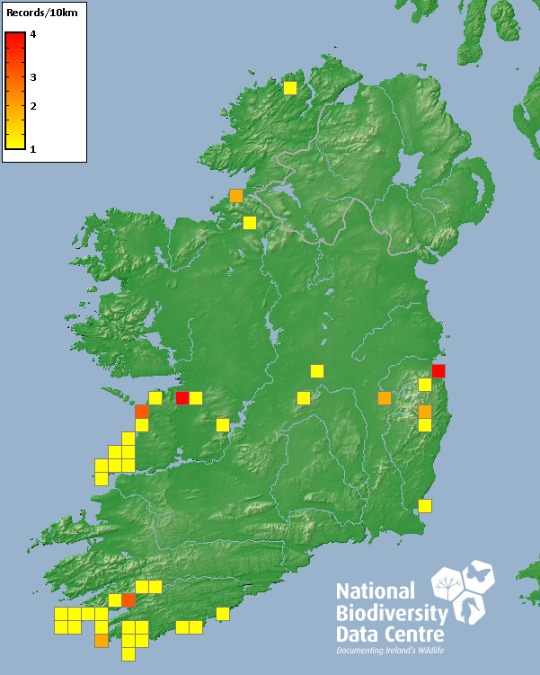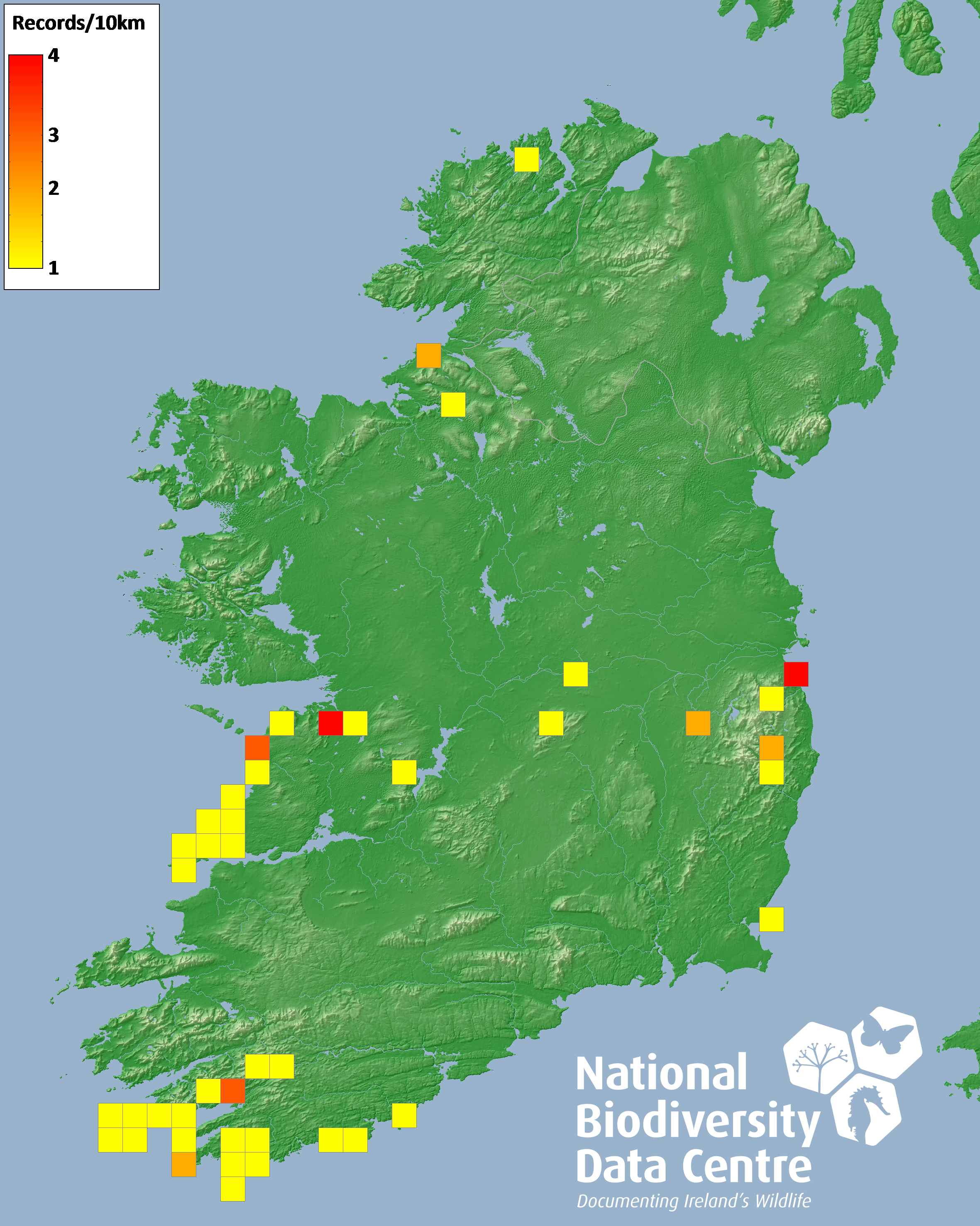 Distribution of the number of records recorded within each 10km grid square (ITM).Marine Map - 50km