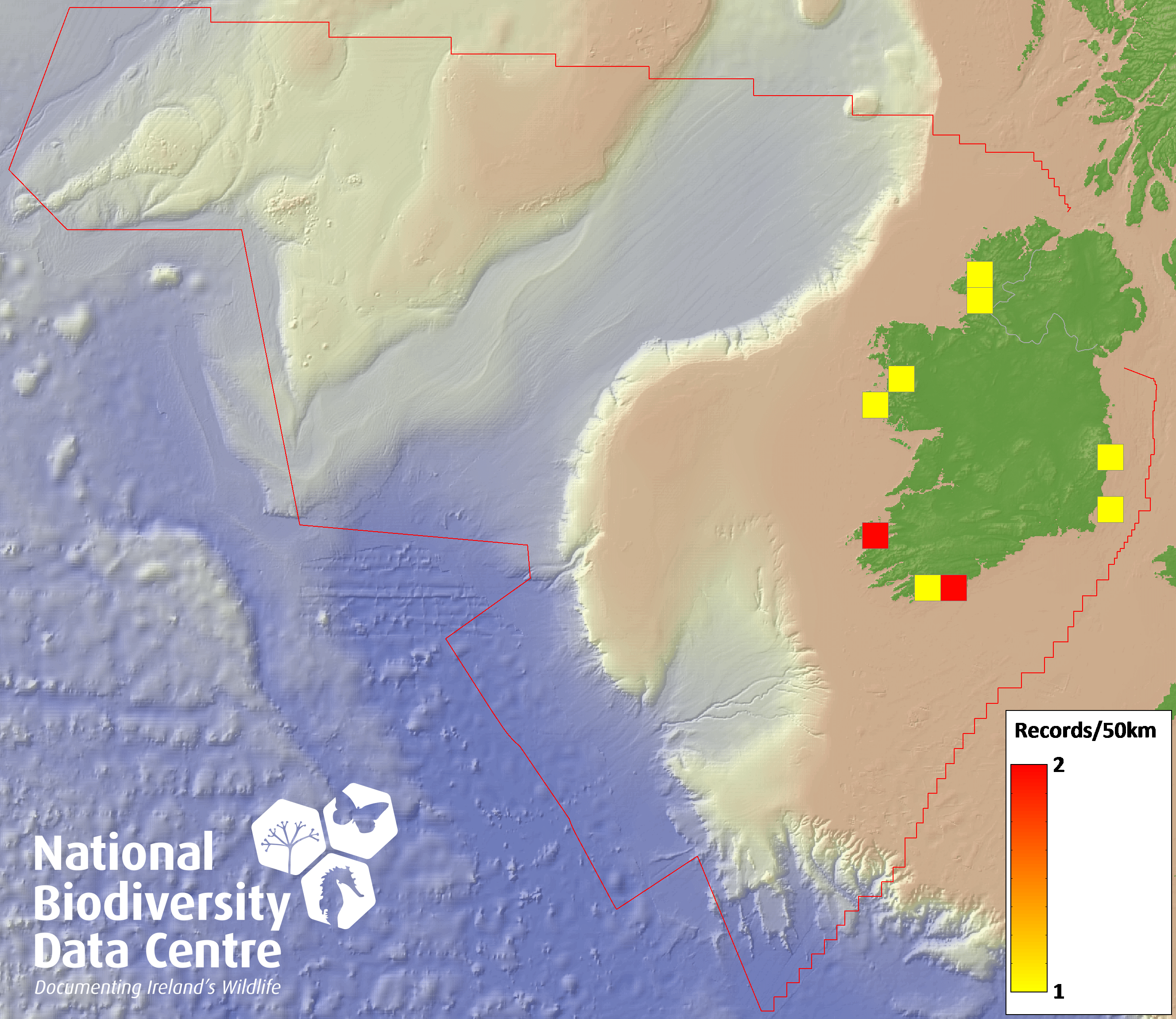 Distribution of the number of records recorded within each 10km grid square (ITM).Marine Map - 50km