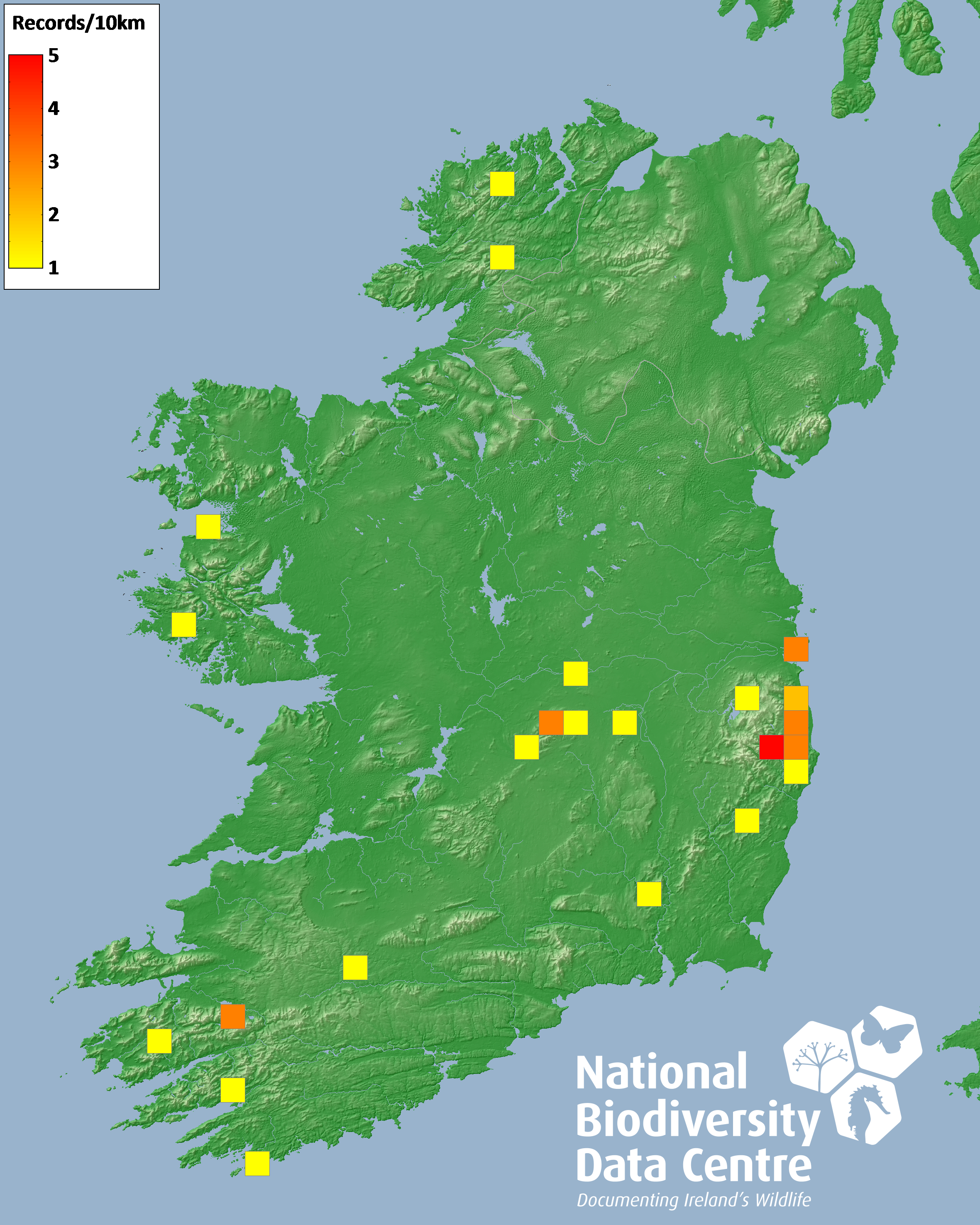 Distribution of the number of records recorded within each 10km grid square (ITM).Marine Map - 50km