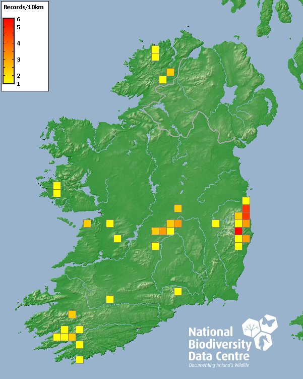 Distribution of the number of records recorded within each 10km grid square (ITM).Marine Map - 50km