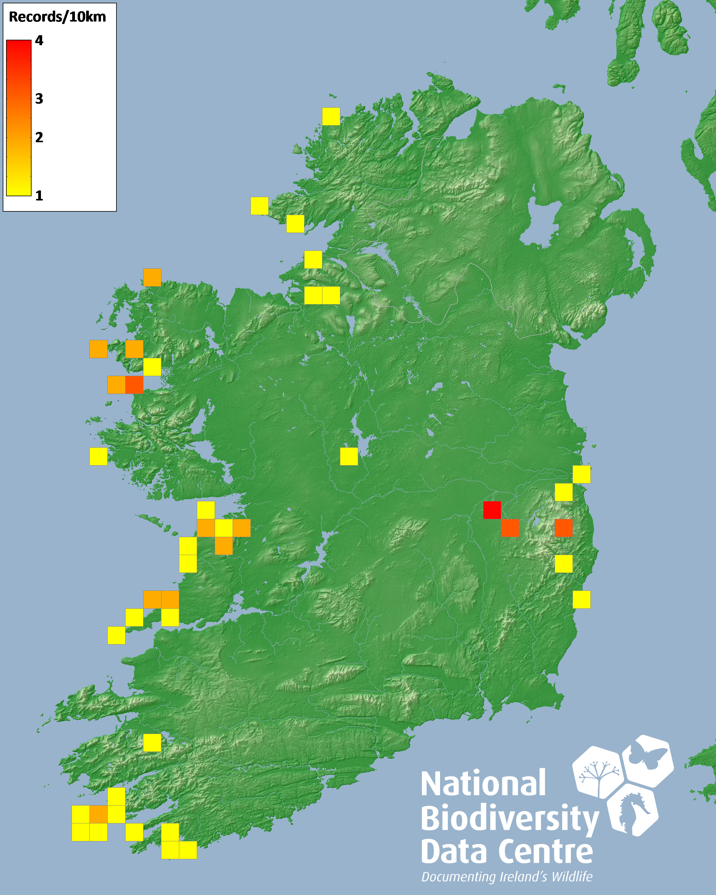 Distribution of the number of records recorded within each 10km grid square (ITM).Marine Map - 50km