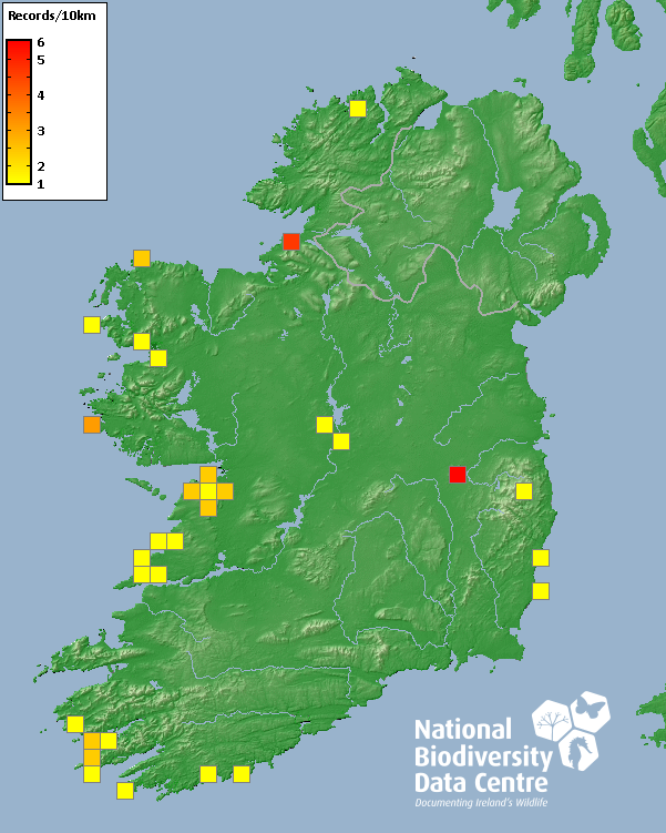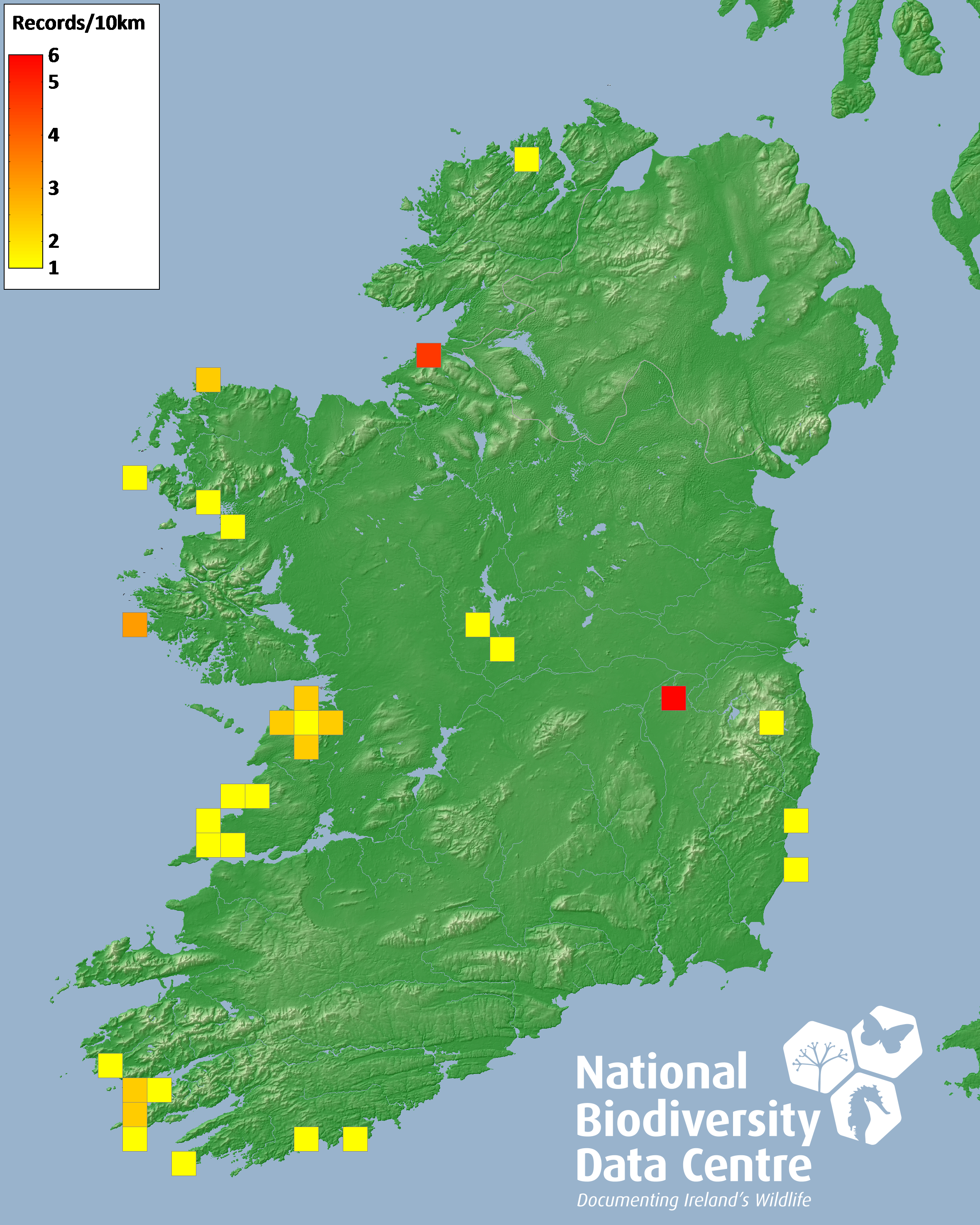 Distribution of the number of records recorded within each 10km grid square (ITM).Marine Map - 50km