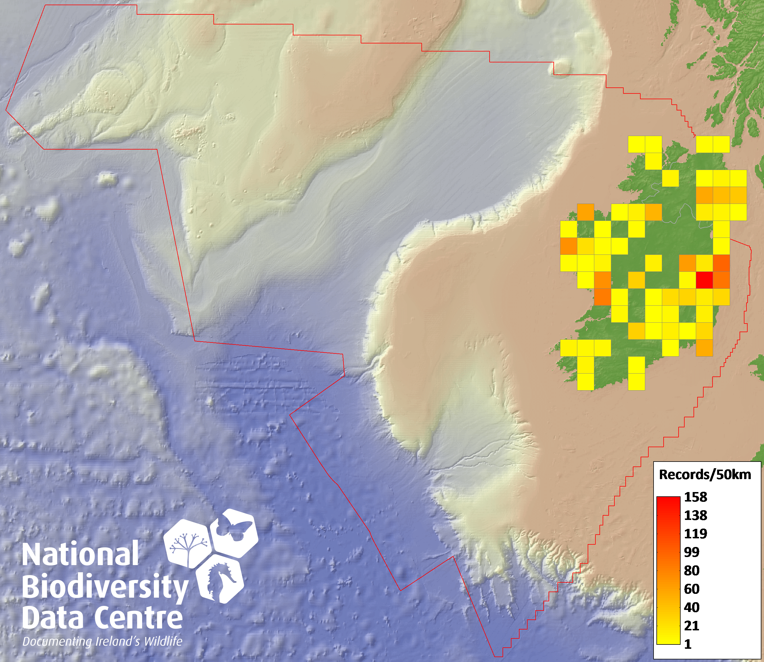 Distribution of the number of records within each 10km grid square (ITM).Marine Map - 50Km