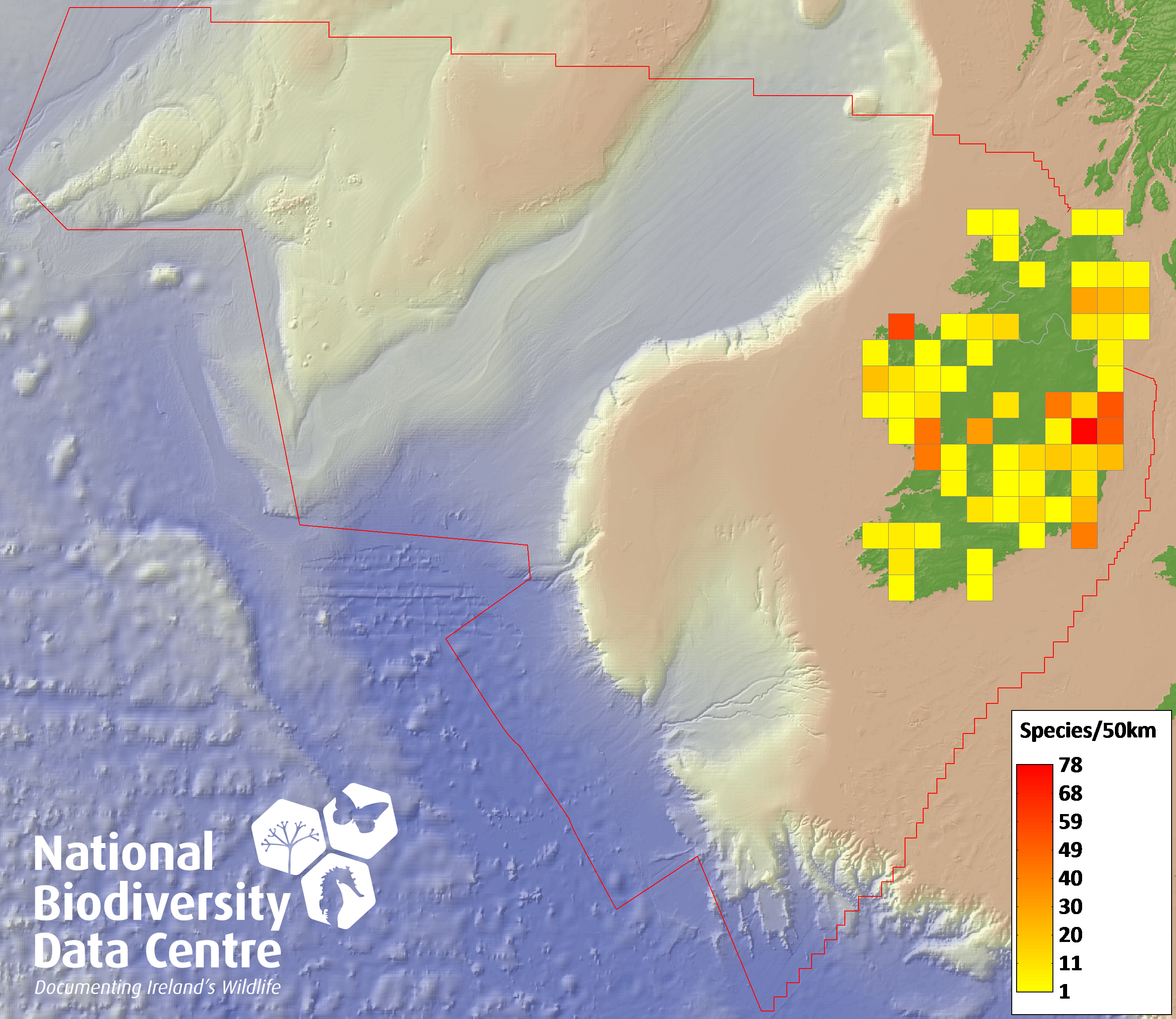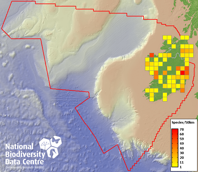 Distribution of the number of species recorded within each 10km grid square (ITM).Marine Map - 50Km
