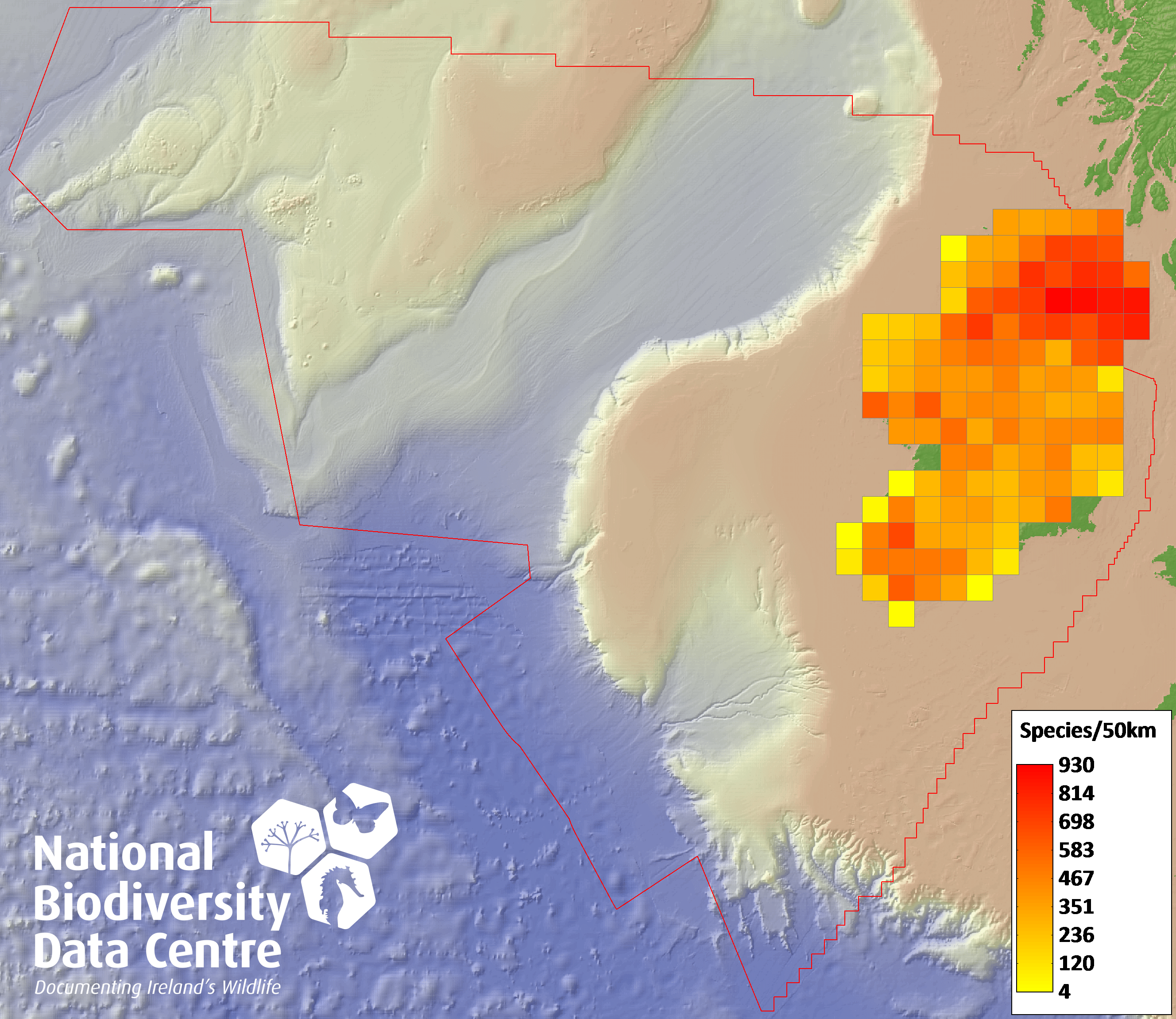 Distribution of the number of species recorded within each 10km grid square (ITM).Marine Map - 50Km