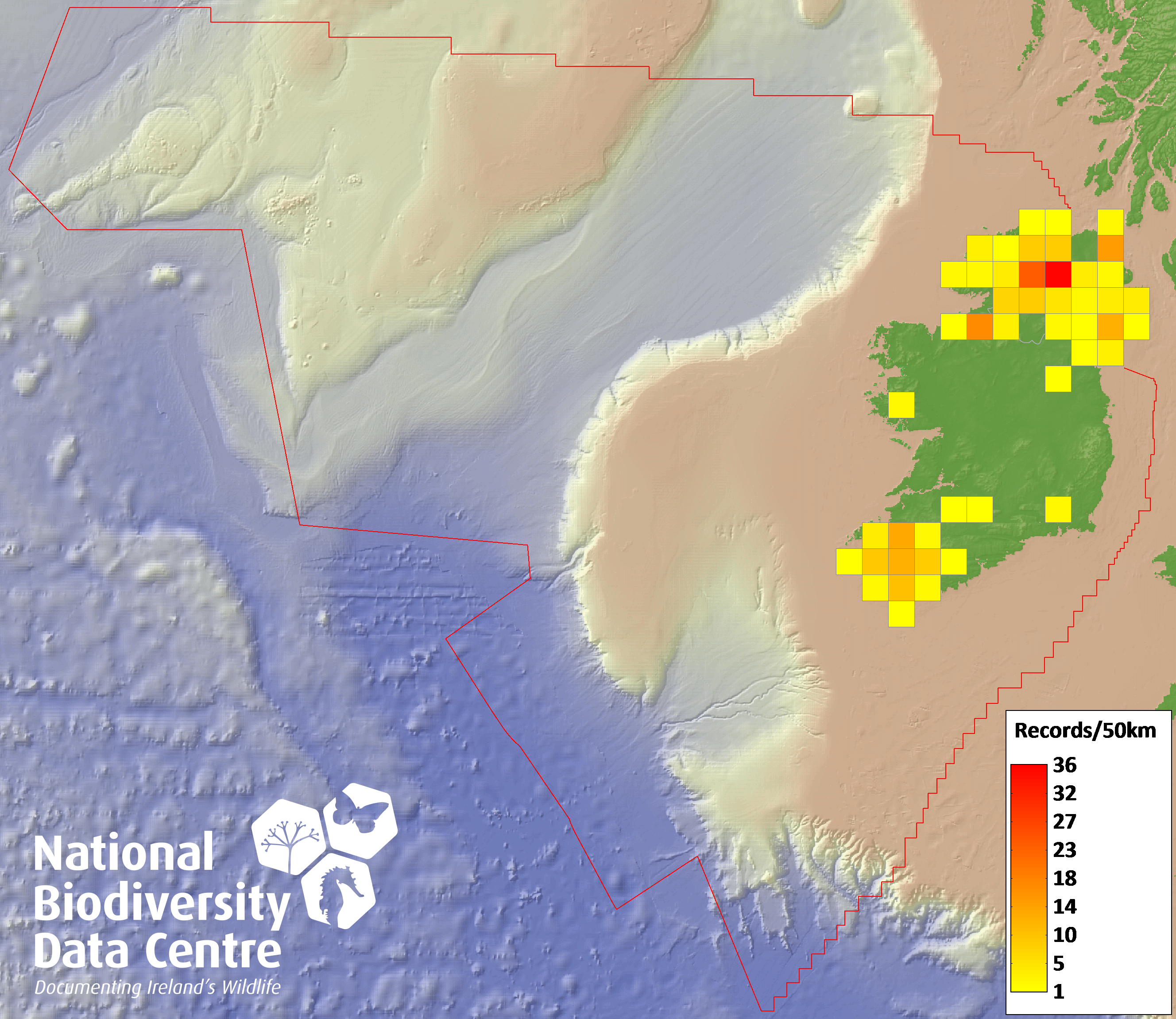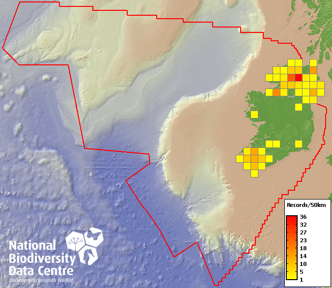 Distribution of the number of records recorded within each 10km grid square (ITM).Marine Map - 50km