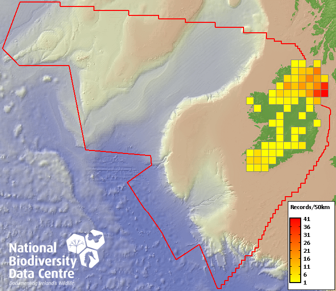 Distribution of the number of records recorded within each 10km grid square (ITM).Marine Map - 50km