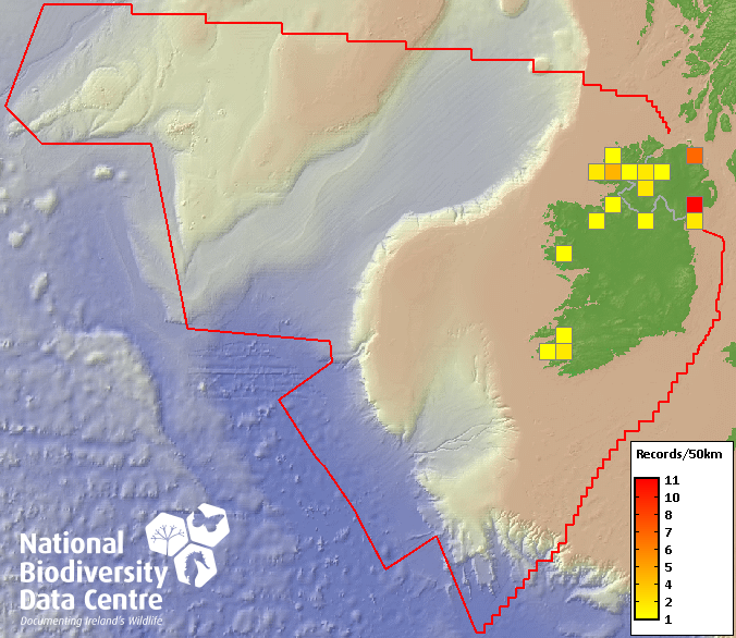 Distribution of the number of records recorded within each 10km grid square (ITM).Marine Map - 50km