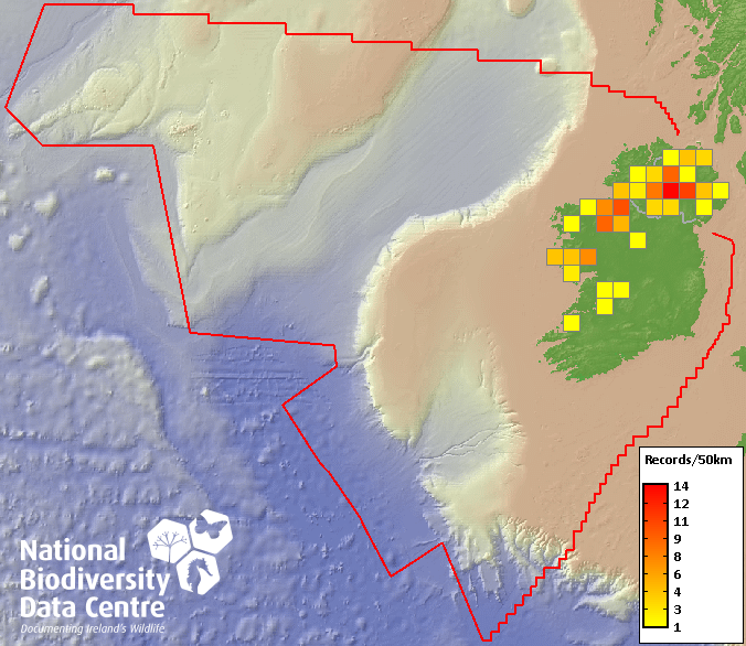 Distribution of the number of records recorded within each 10km grid square (ITM).Marine Map - 50km