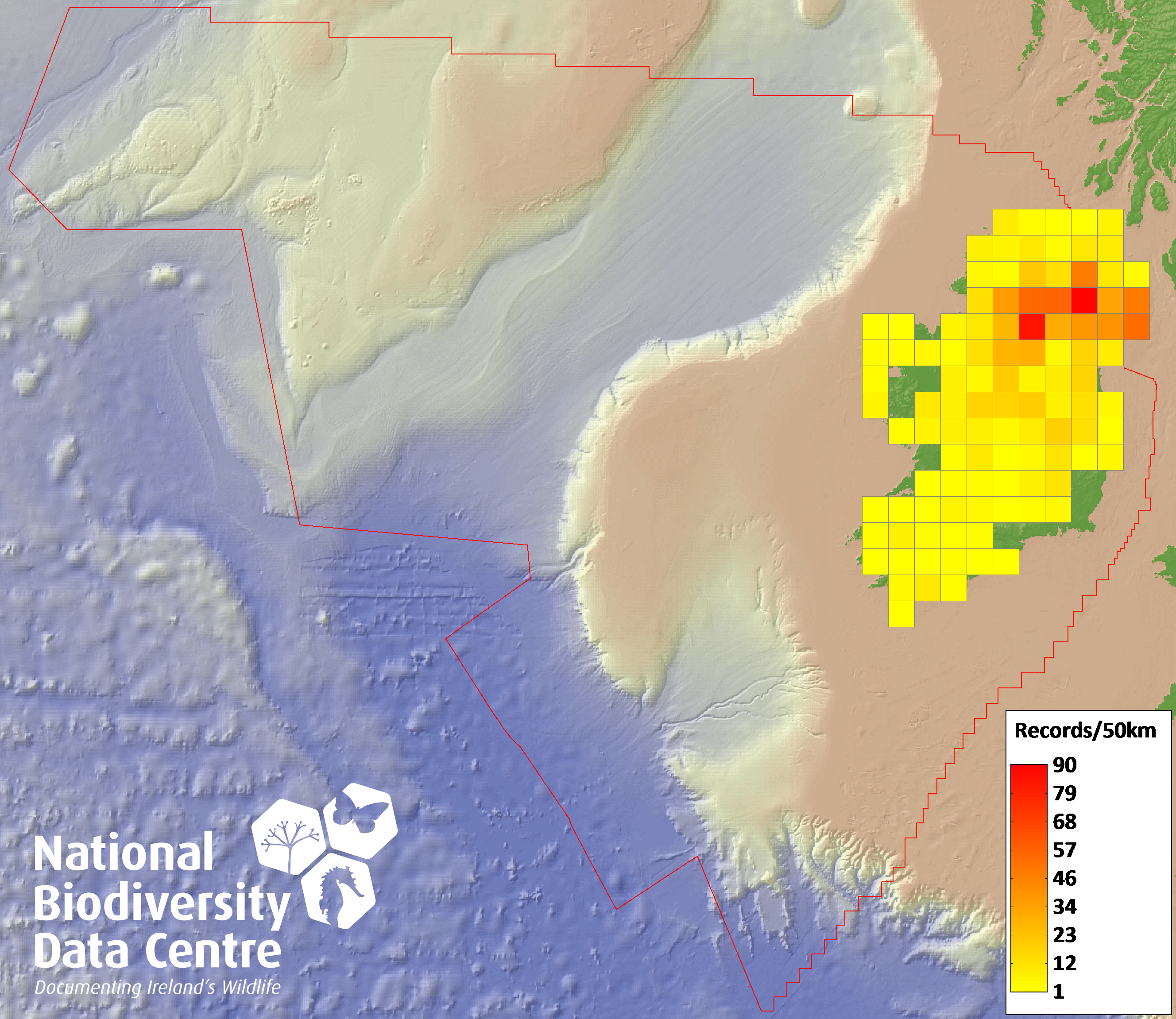 Distribution of the number of records recorded within each 10km grid square (ITM).Marine Map - 50km