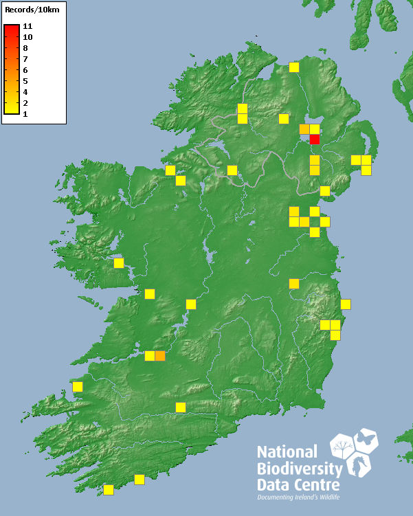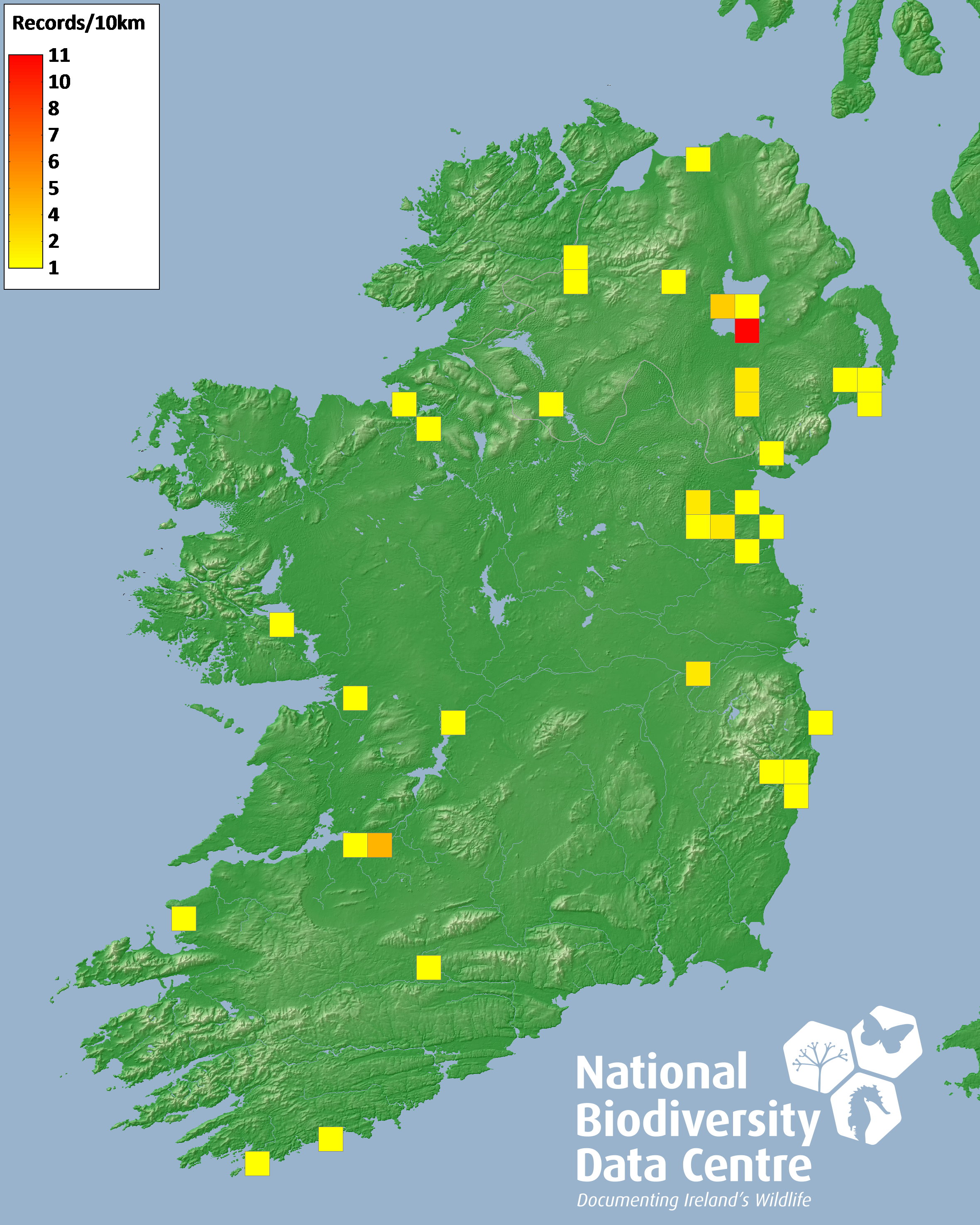 Distribution of the number of records recorded within each 10km grid square (ITM).Marine Map - 50km