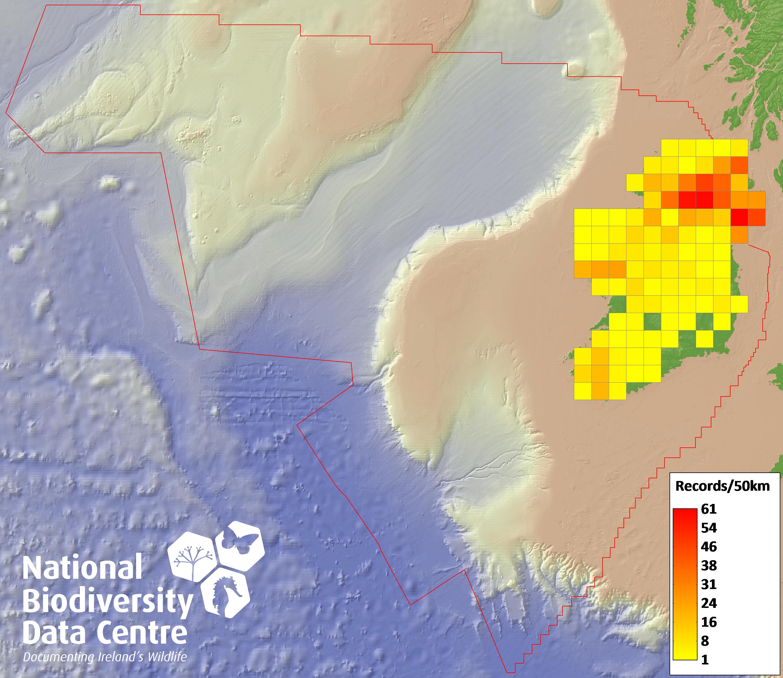 Distribution of the number of records recorded within each 10km grid square (ITM).Marine Map - 50km