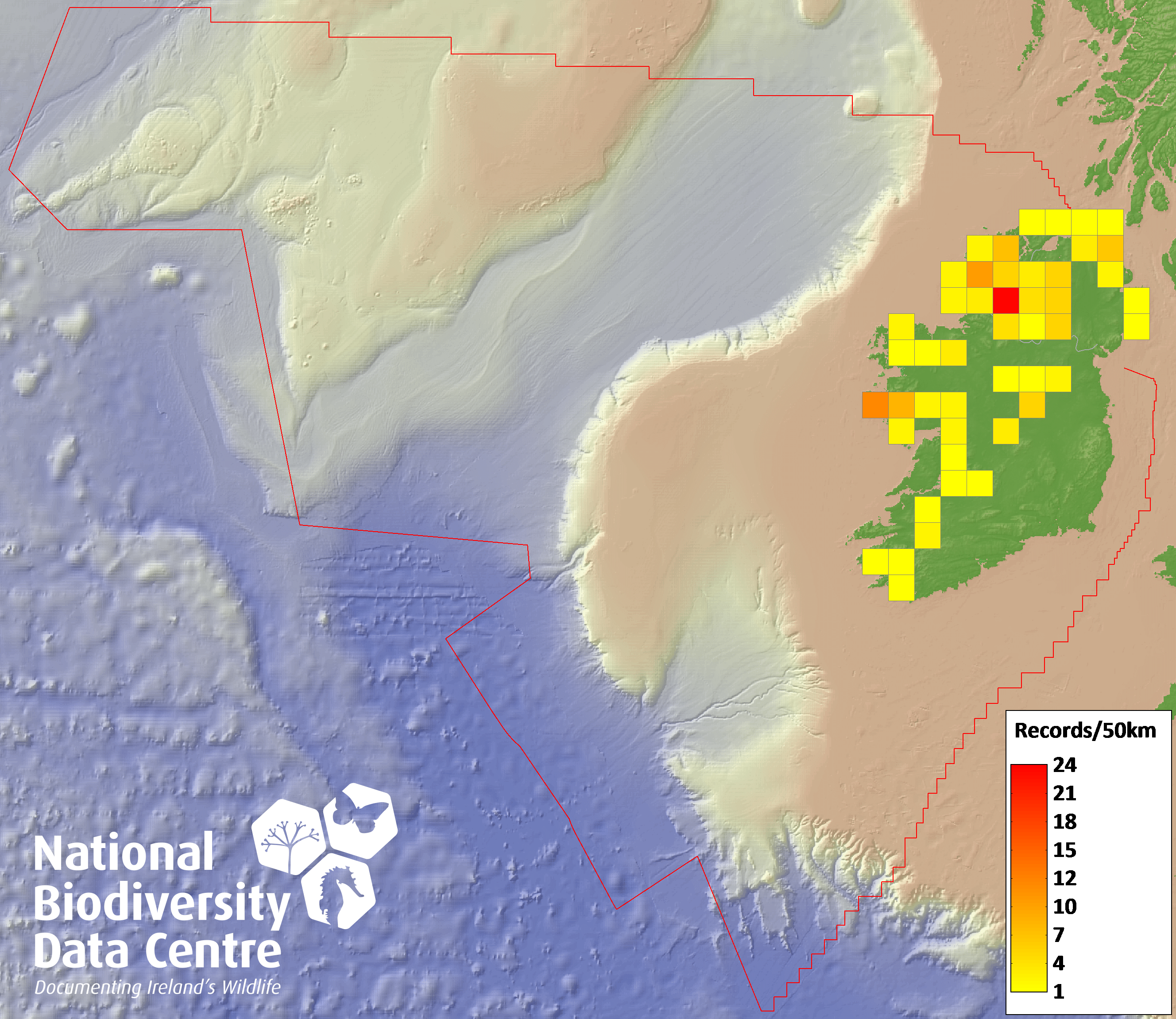 Distribution of the number of records recorded within each 10km grid square (ITM).Marine Map - 50km