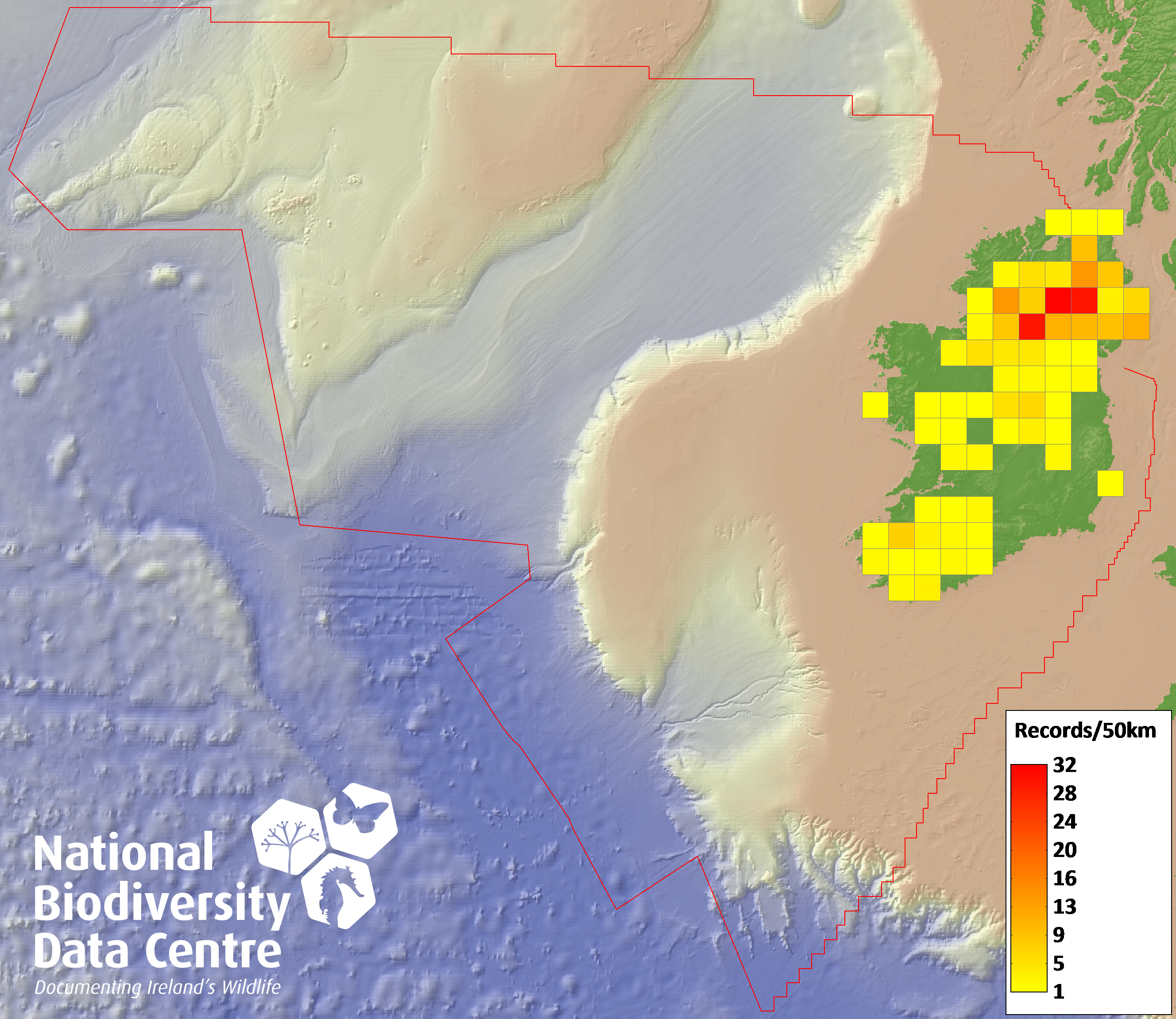 Distribution of the number of records recorded within each 10km grid square (ITM).Marine Map - 50km