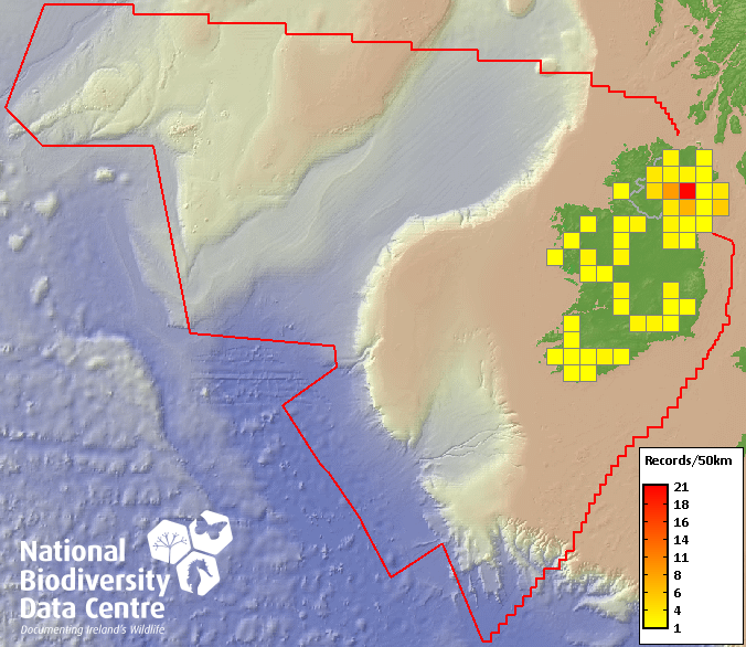 Distribution of the number of records recorded within each 10km grid square (ITM).Marine Map - 50km