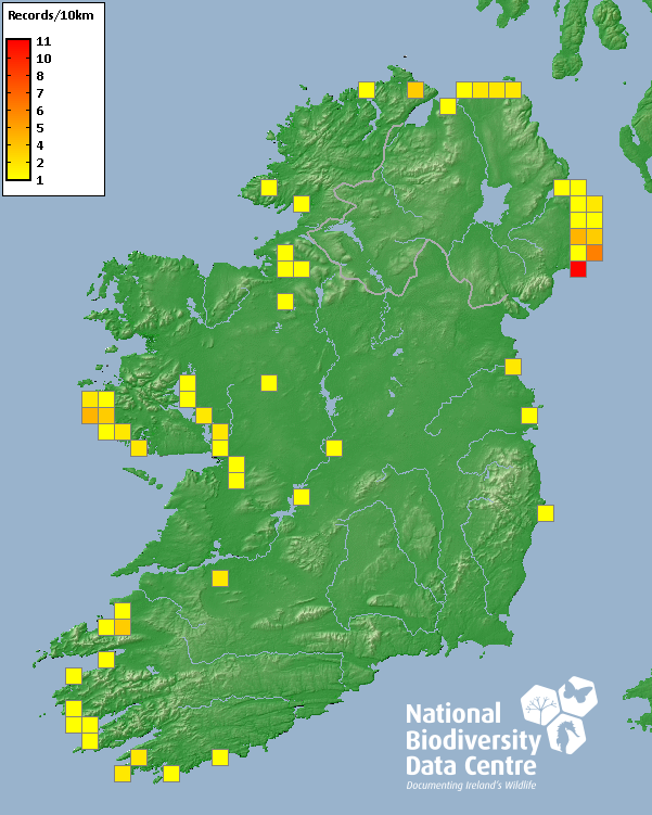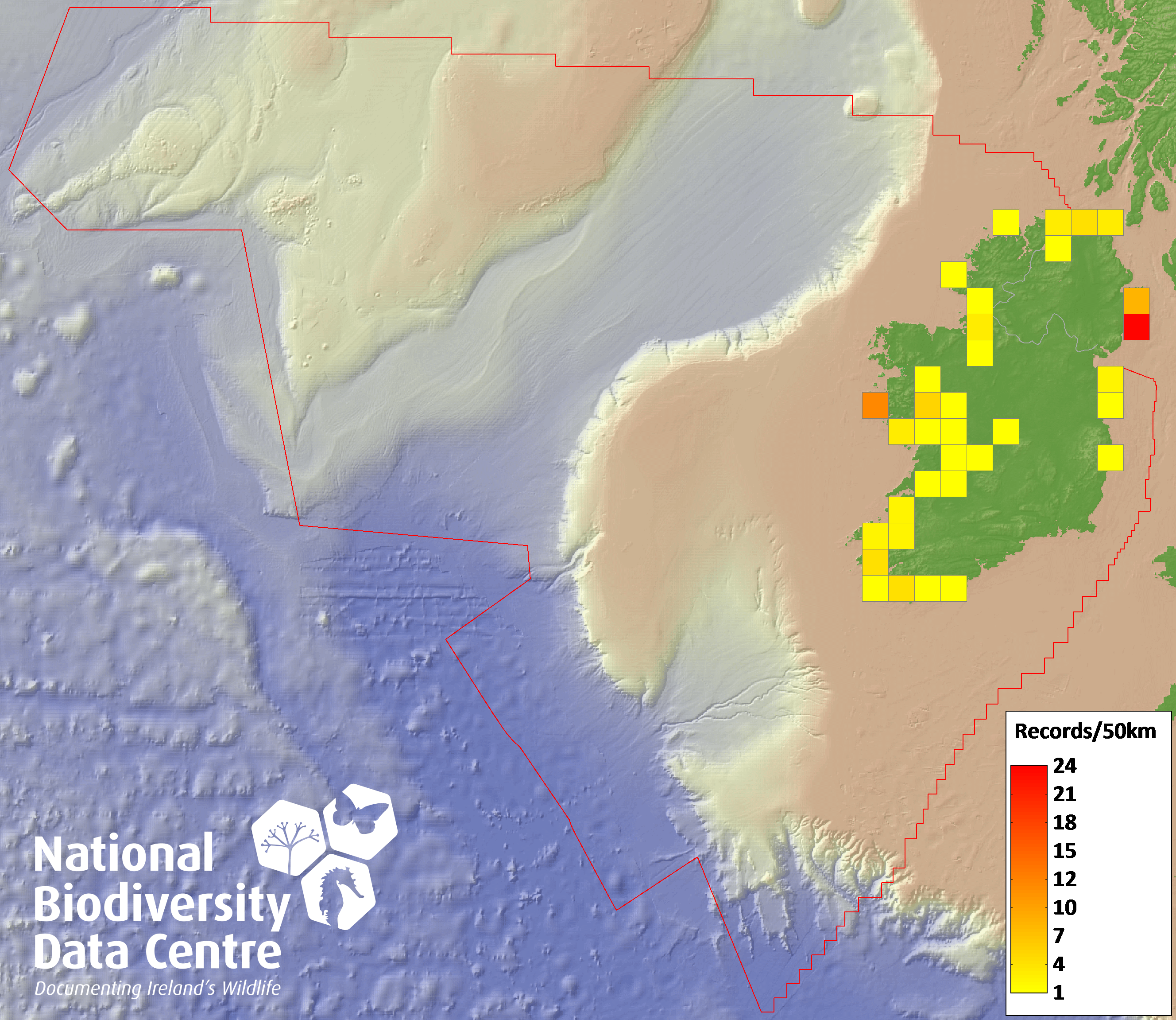 Distribution of the number of records recorded within each 10km grid square (ITM).Marine Map - 50km
