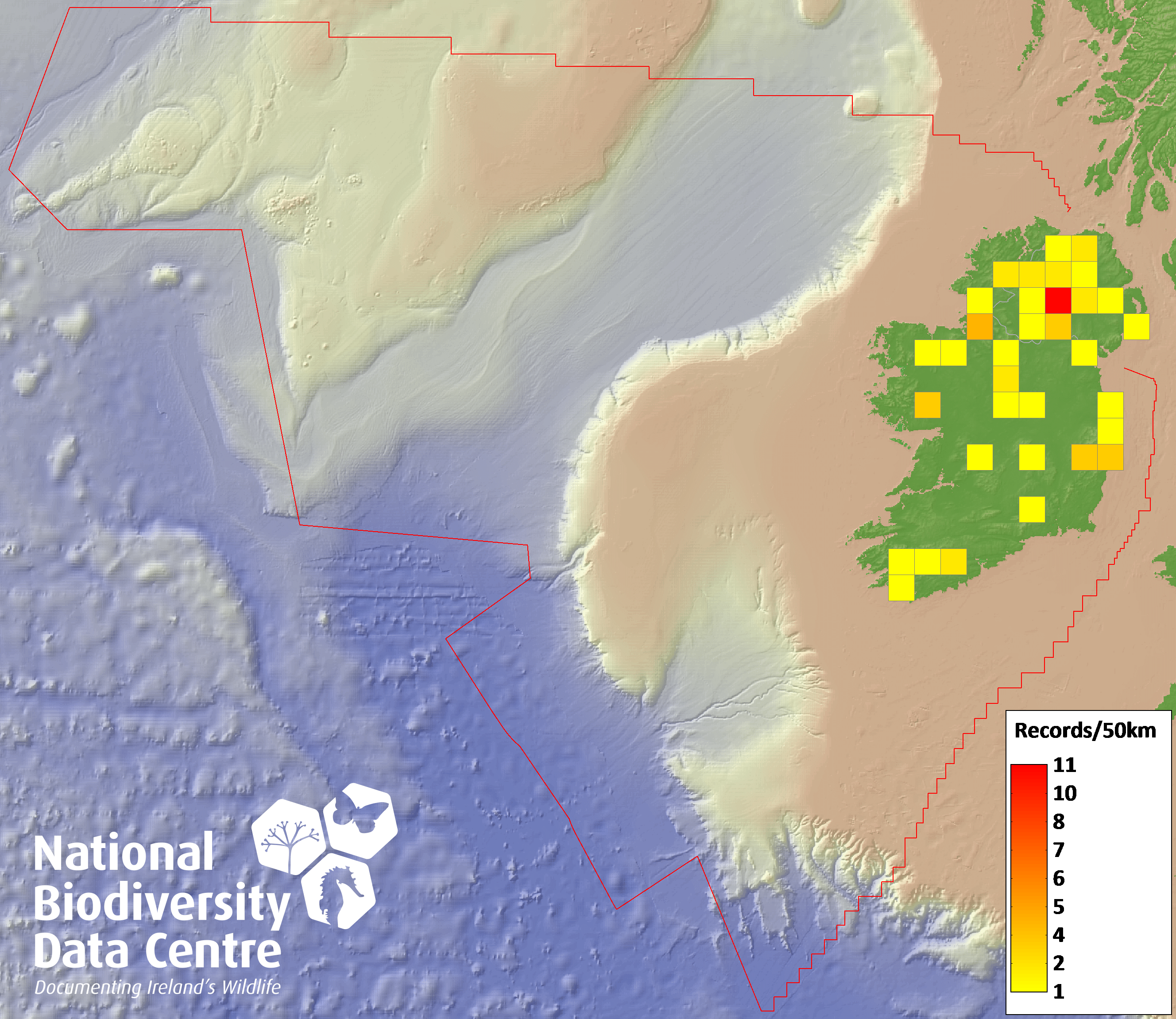 Distribution of the number of records recorded within each 10km grid square (ITM).Marine Map - 50km