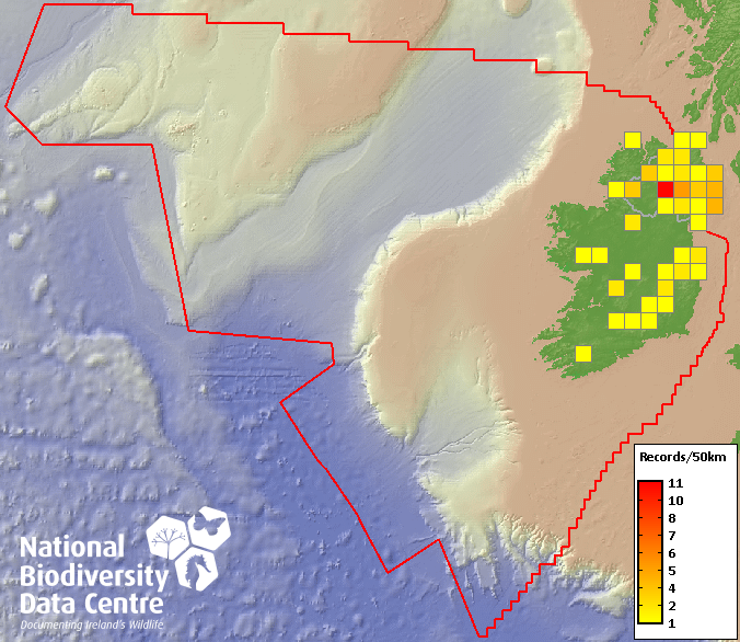 Distribution of the number of records recorded within each 10km grid square (ITM).Marine Map - 50km