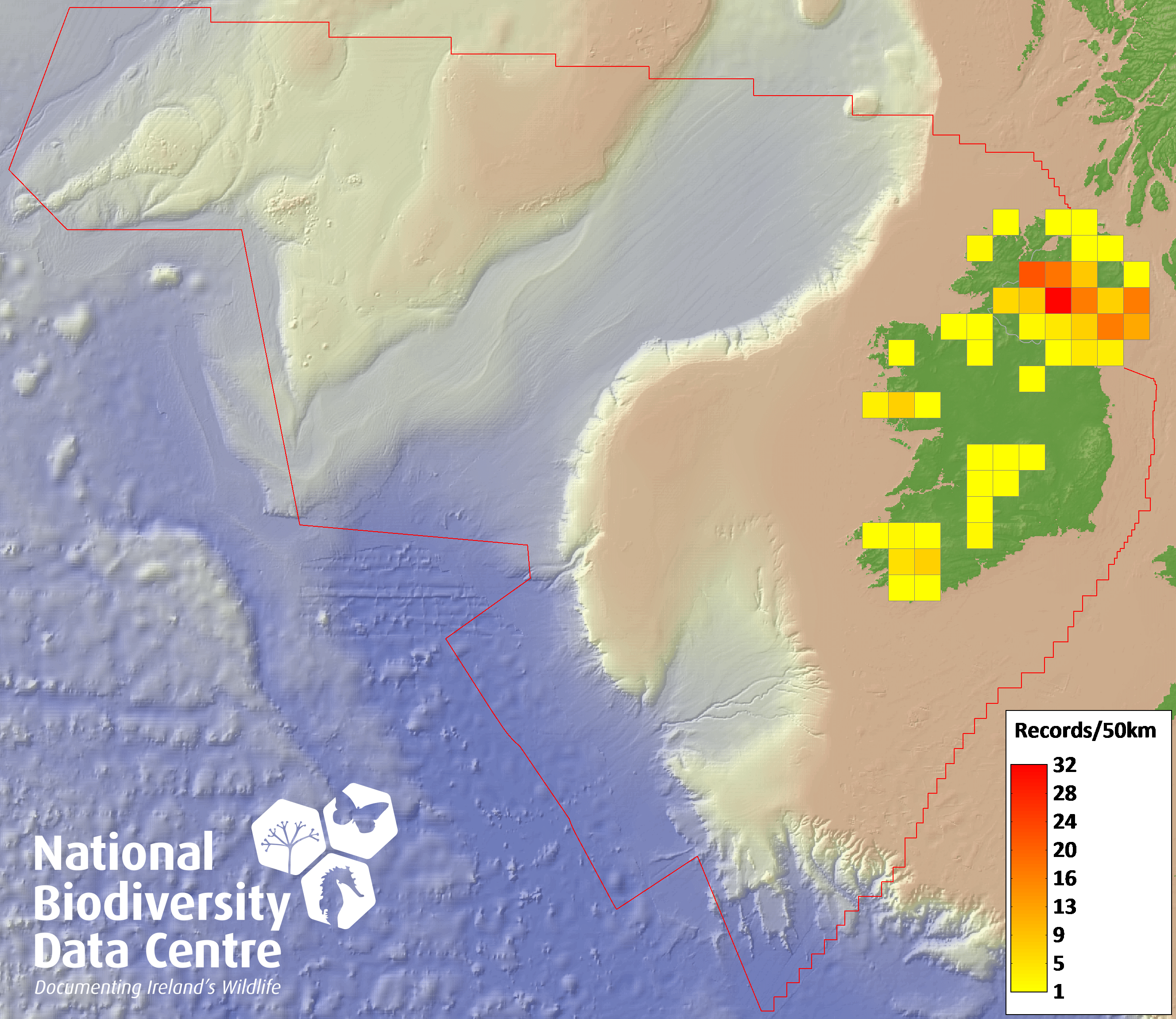 Distribution of the number of records recorded within each 10km grid square (ITM).Marine Map - 50km