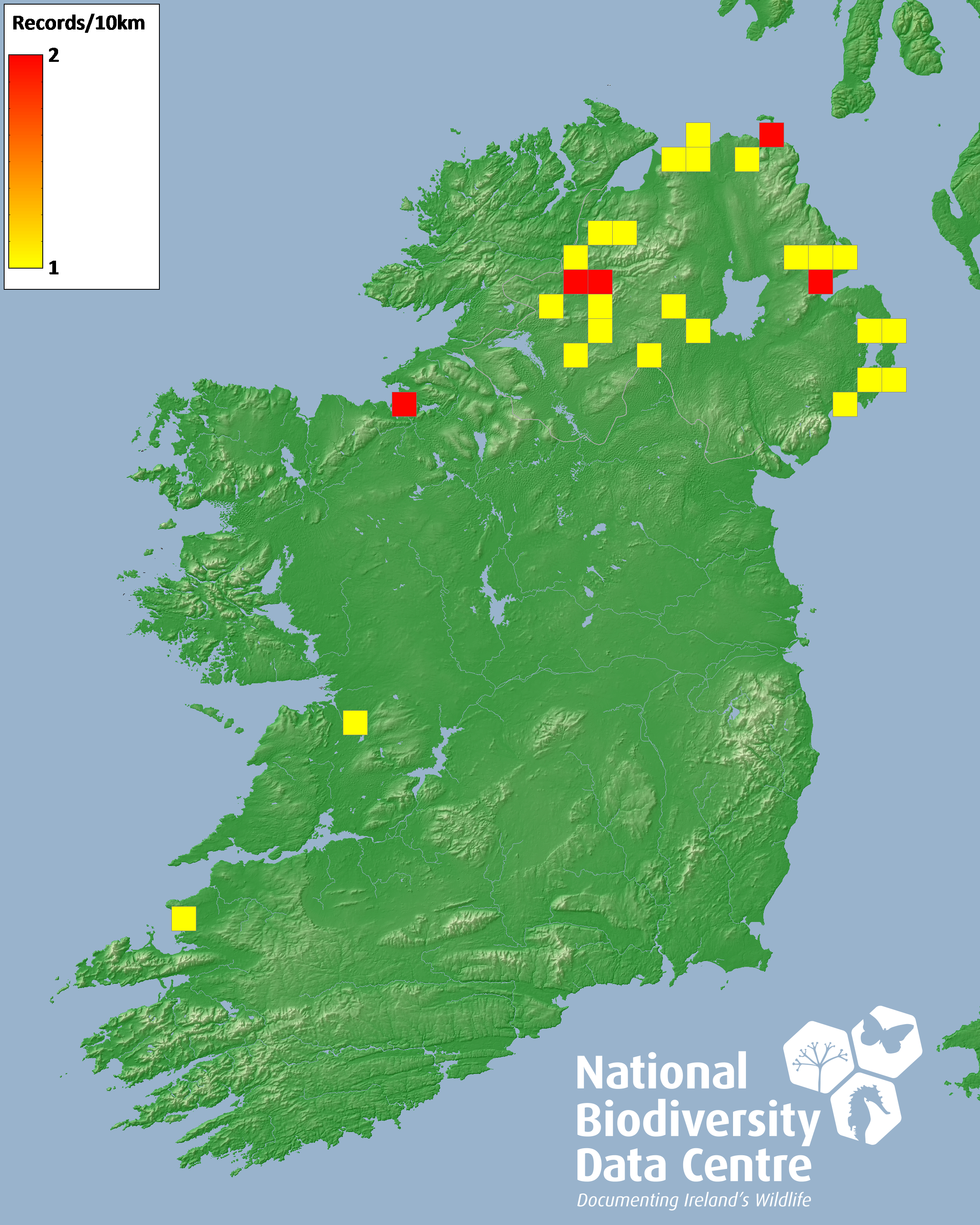 Distribution of the number of records recorded within each 10km grid square (ITM).Marine Map - 50km