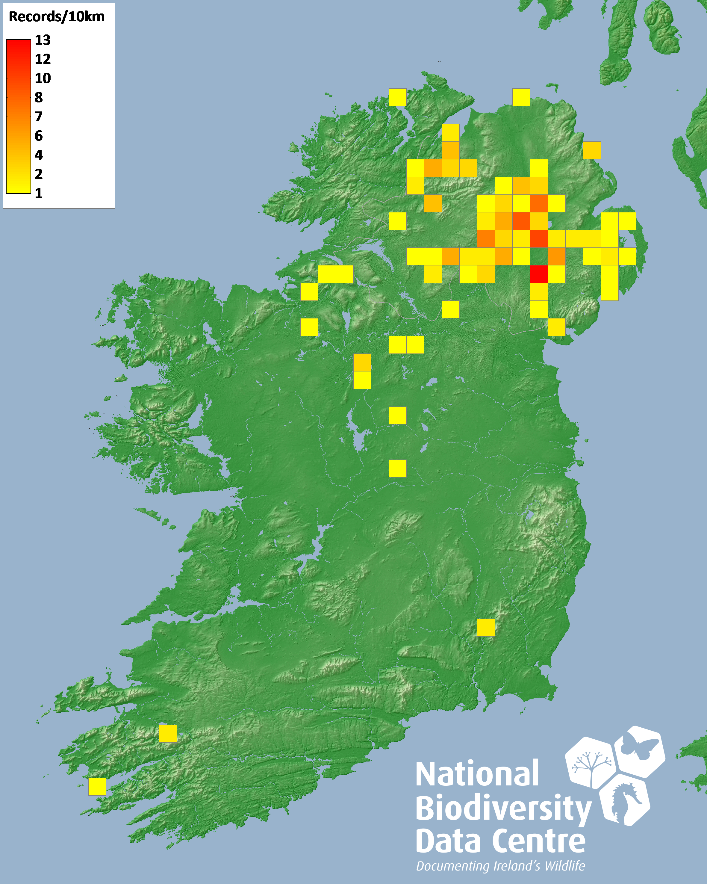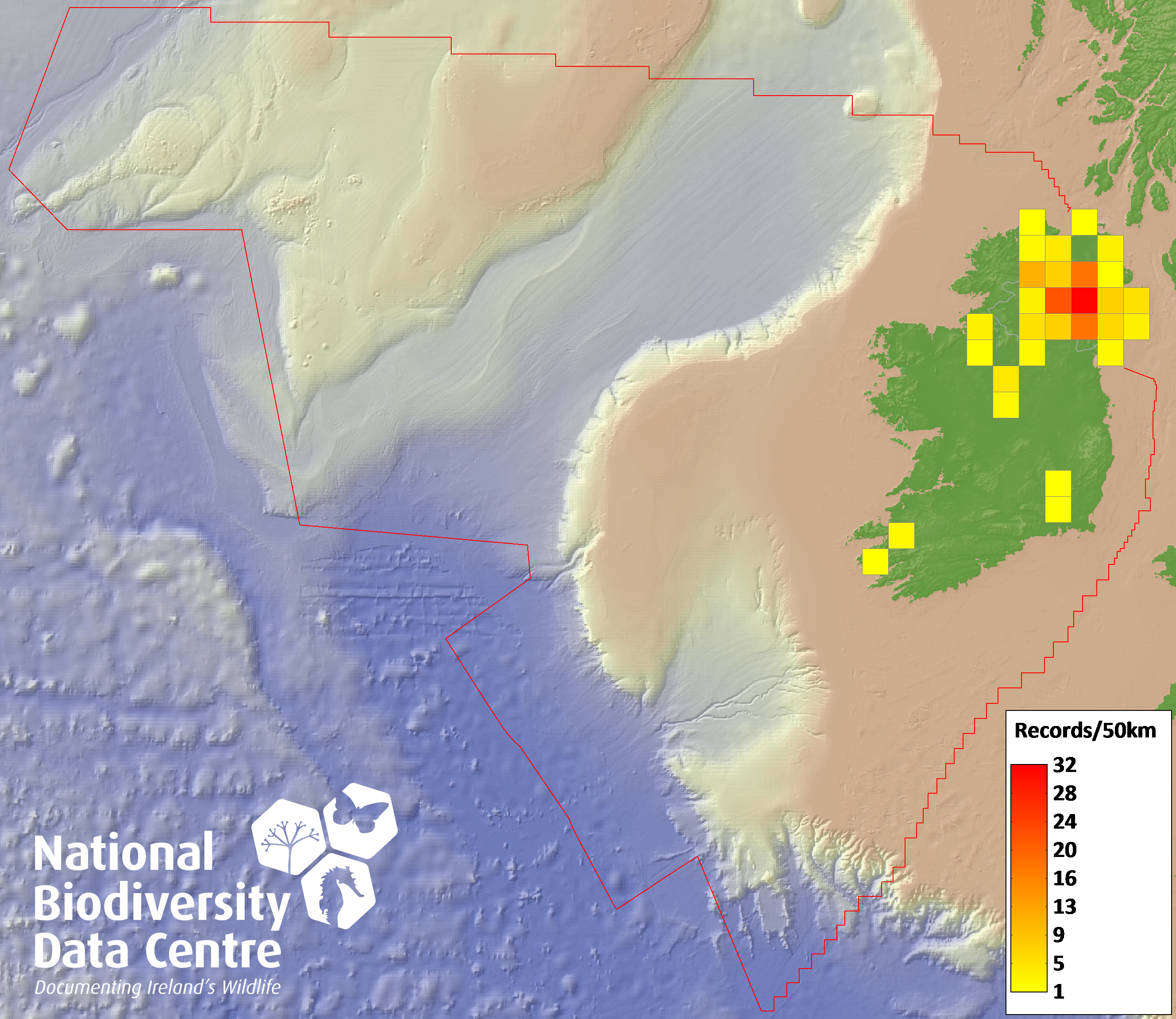 Distribution of the number of records recorded within each 10km grid square (ITM).Marine Map - 50km
