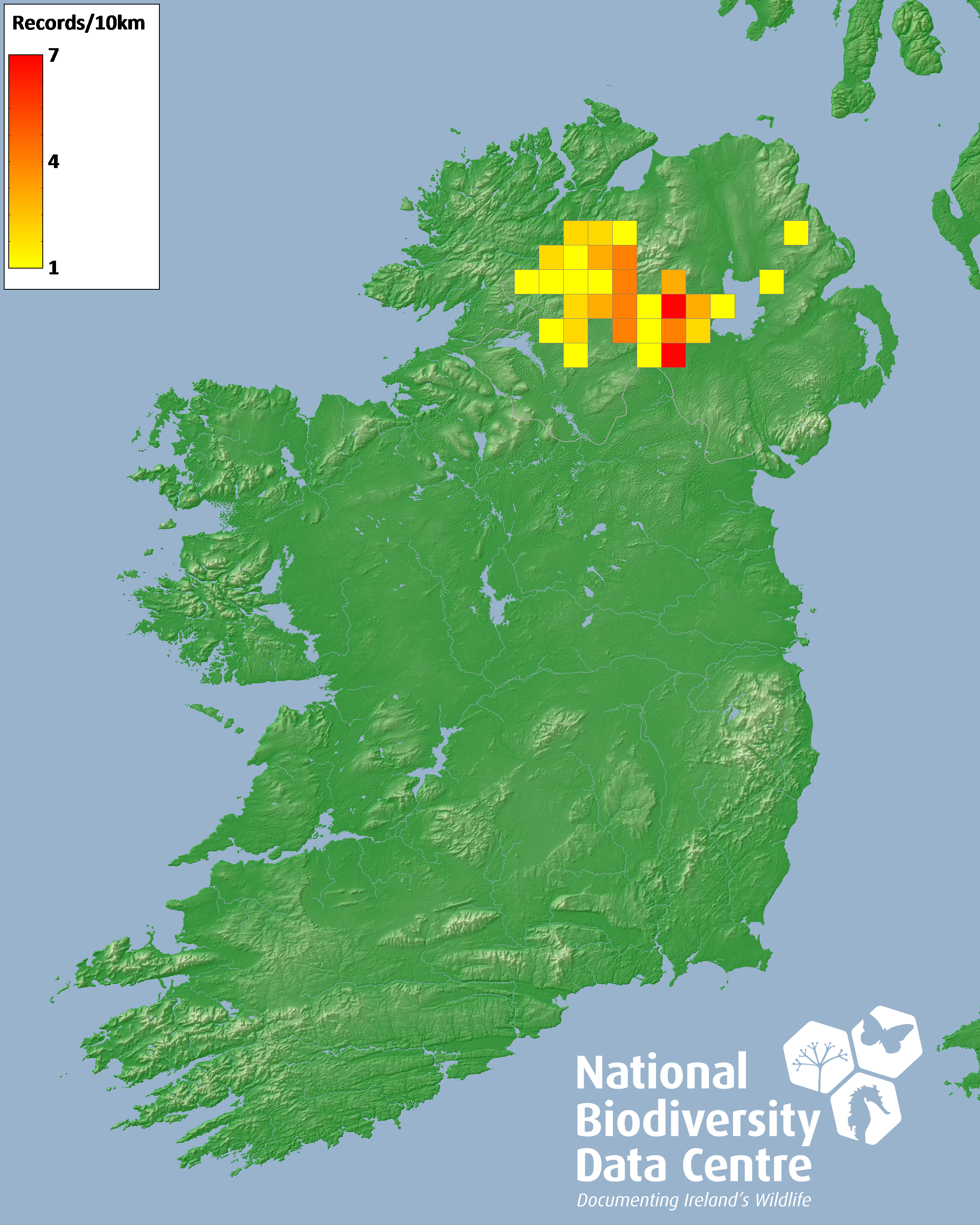 Distribution of the number of records recorded within each 10km grid square (ITM).Marine Map - 50km