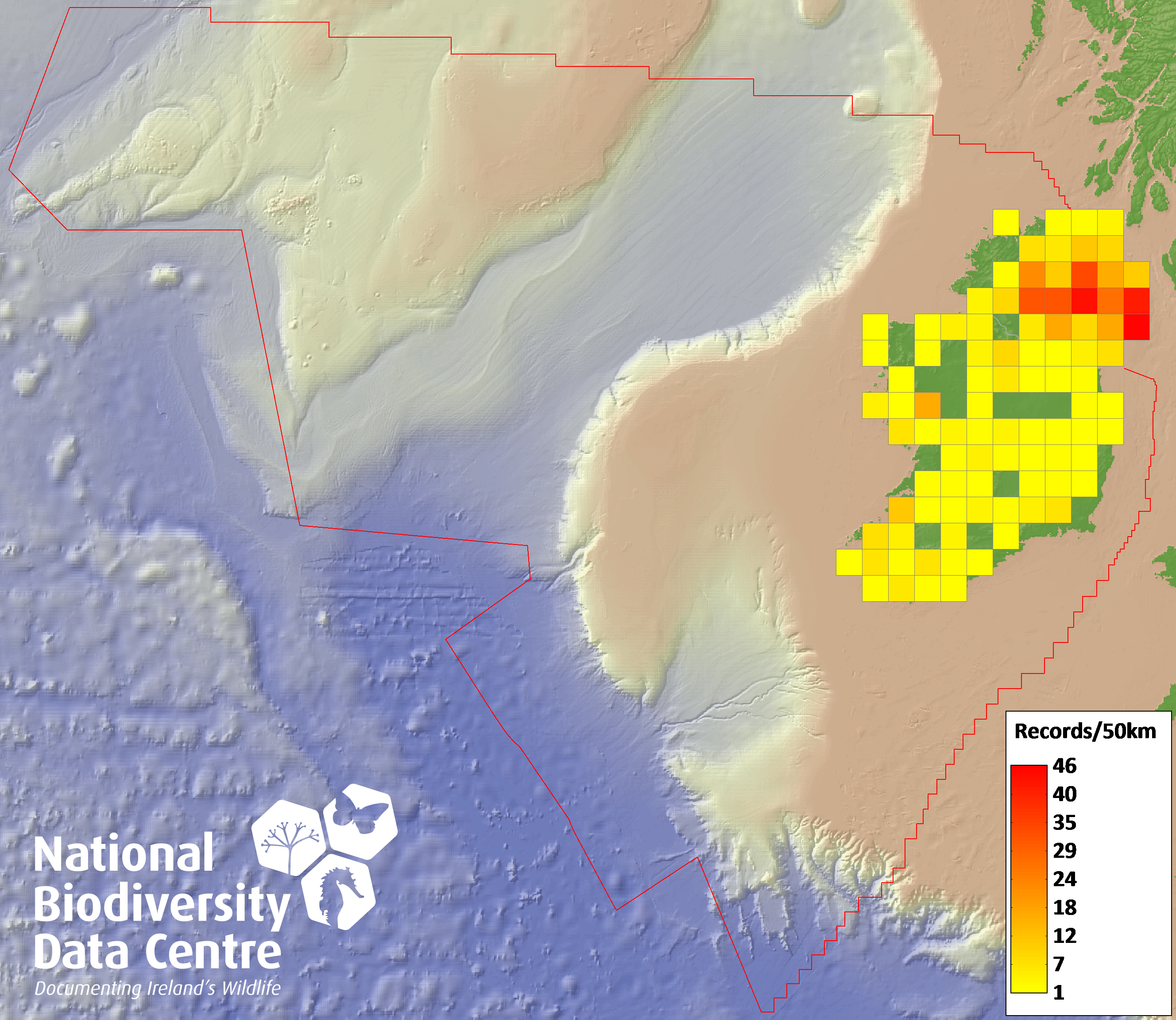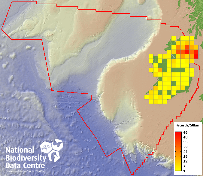Distribution of the number of records recorded within each 10km grid square (ITM).Marine Map - 50km