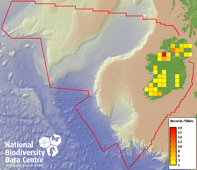 Distribution of the number of records recorded within each 10km grid square (ITM).Marine Map - 50km