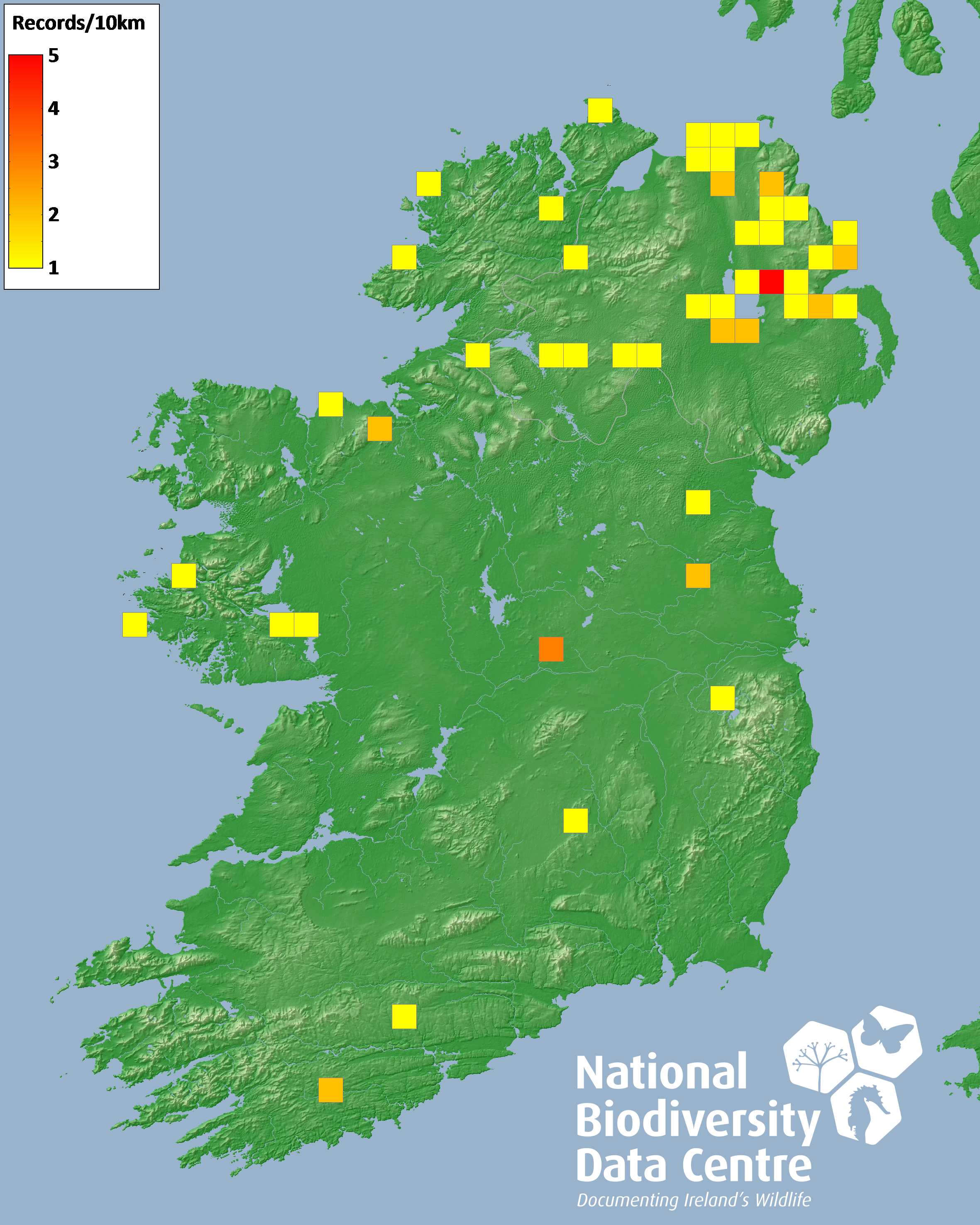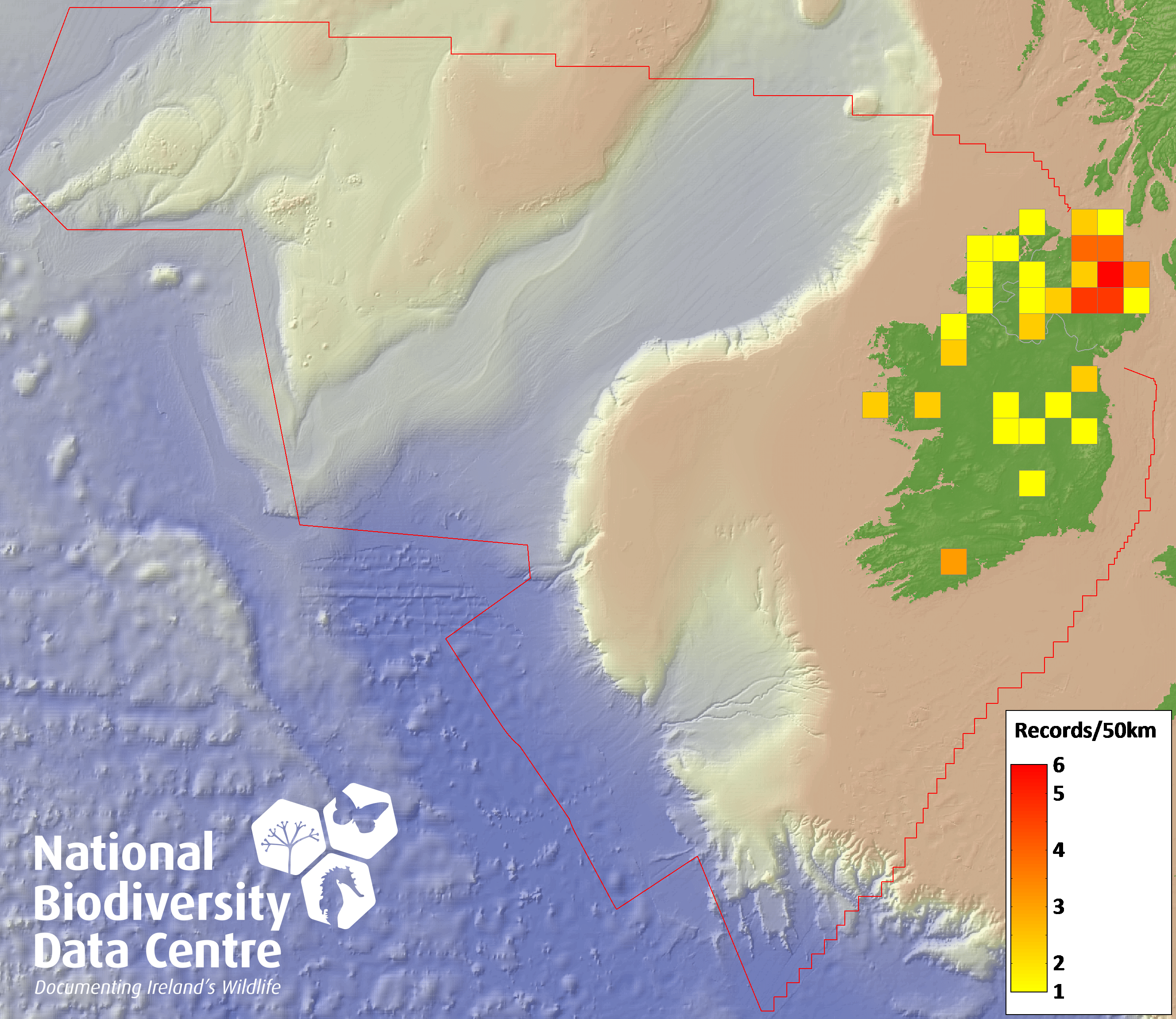 Distribution of the number of records recorded within each 10km grid square (ITM).Marine Map - 50km