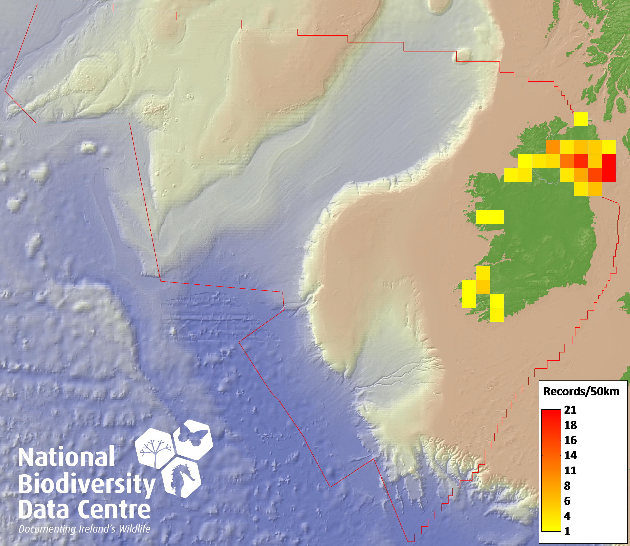 Distribution of the number of records recorded within each 10km grid square (ITM).Marine Map - 50km