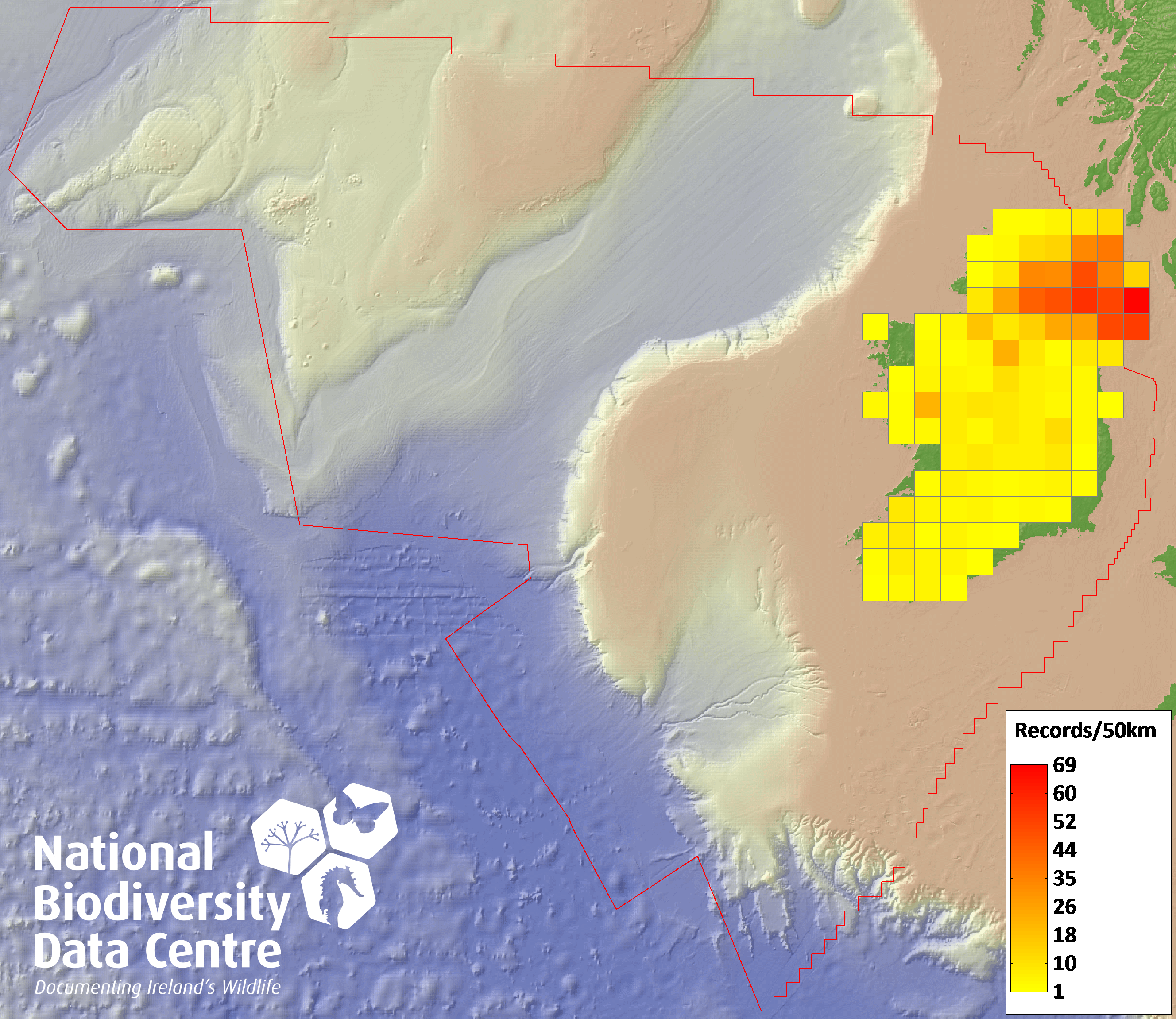Distribution of the number of records recorded within each 10km grid square (ITM).Marine Map - 50km