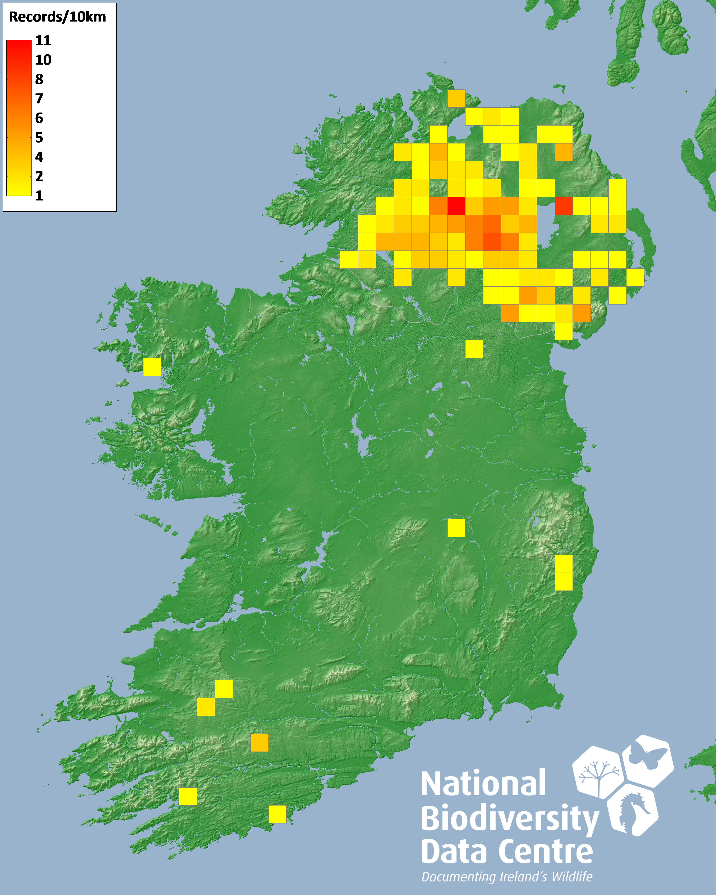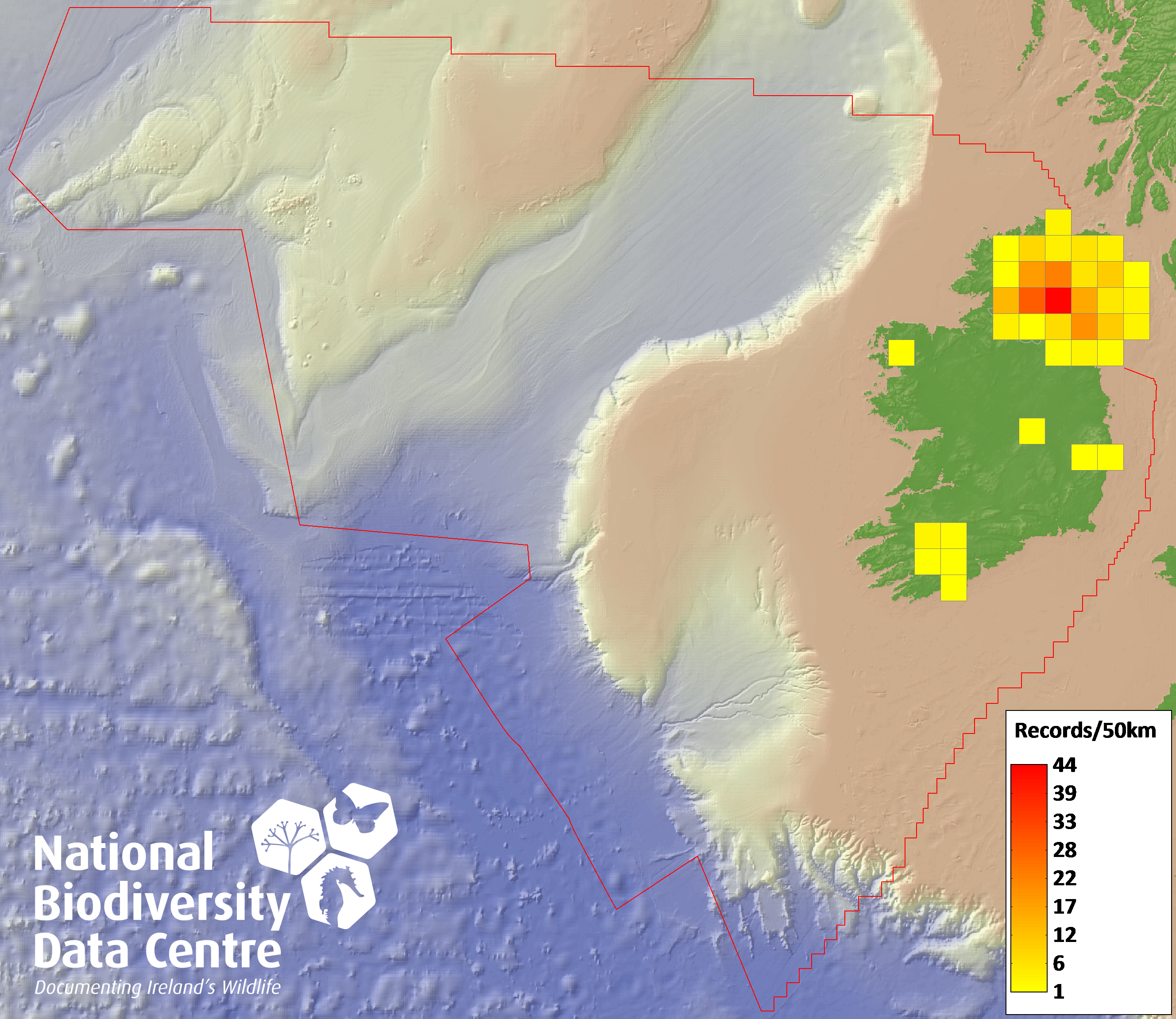 Distribution of the number of records recorded within each 10km grid square (ITM).Marine Map - 50km