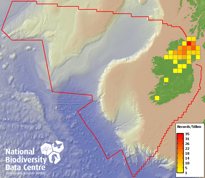 Distribution of the number of records recorded within each 10km grid square (ITM).Marine Map - 50km
