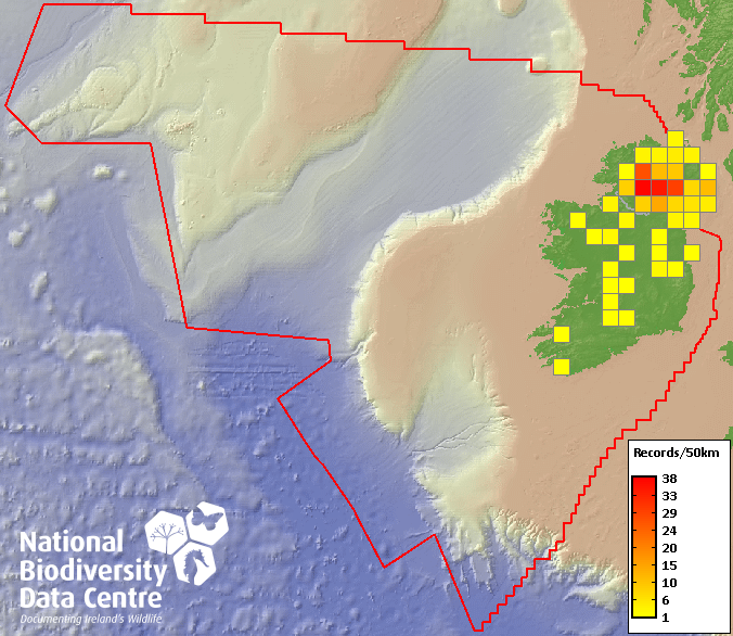 Distribution of the number of records recorded within each 10km grid square (ITM).Marine Map - 50km